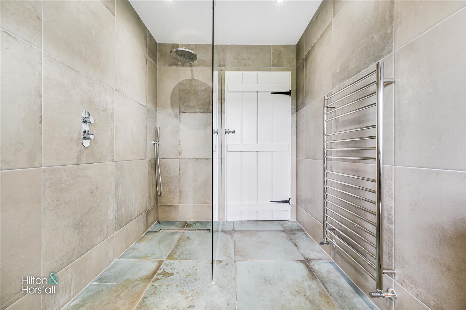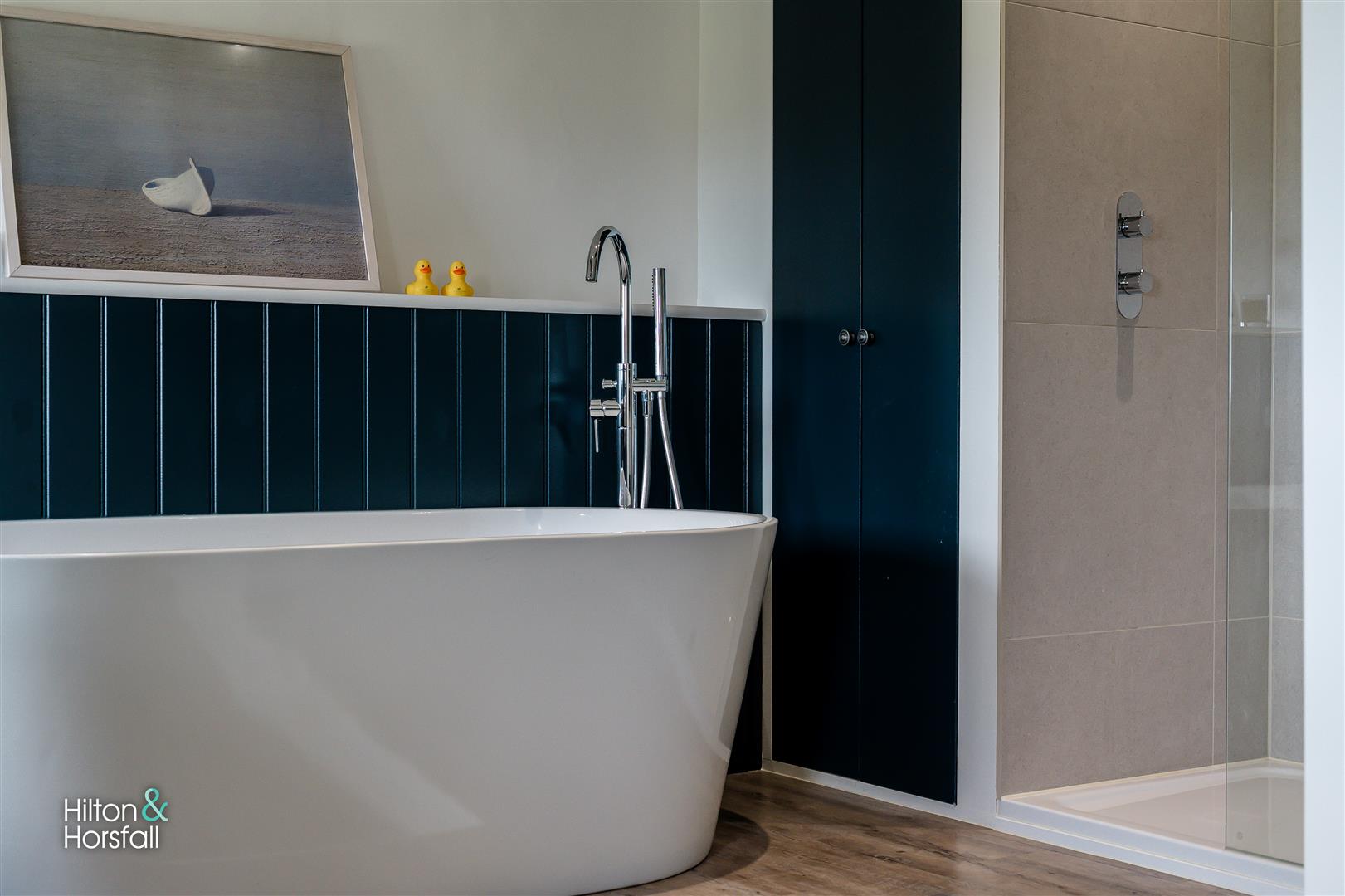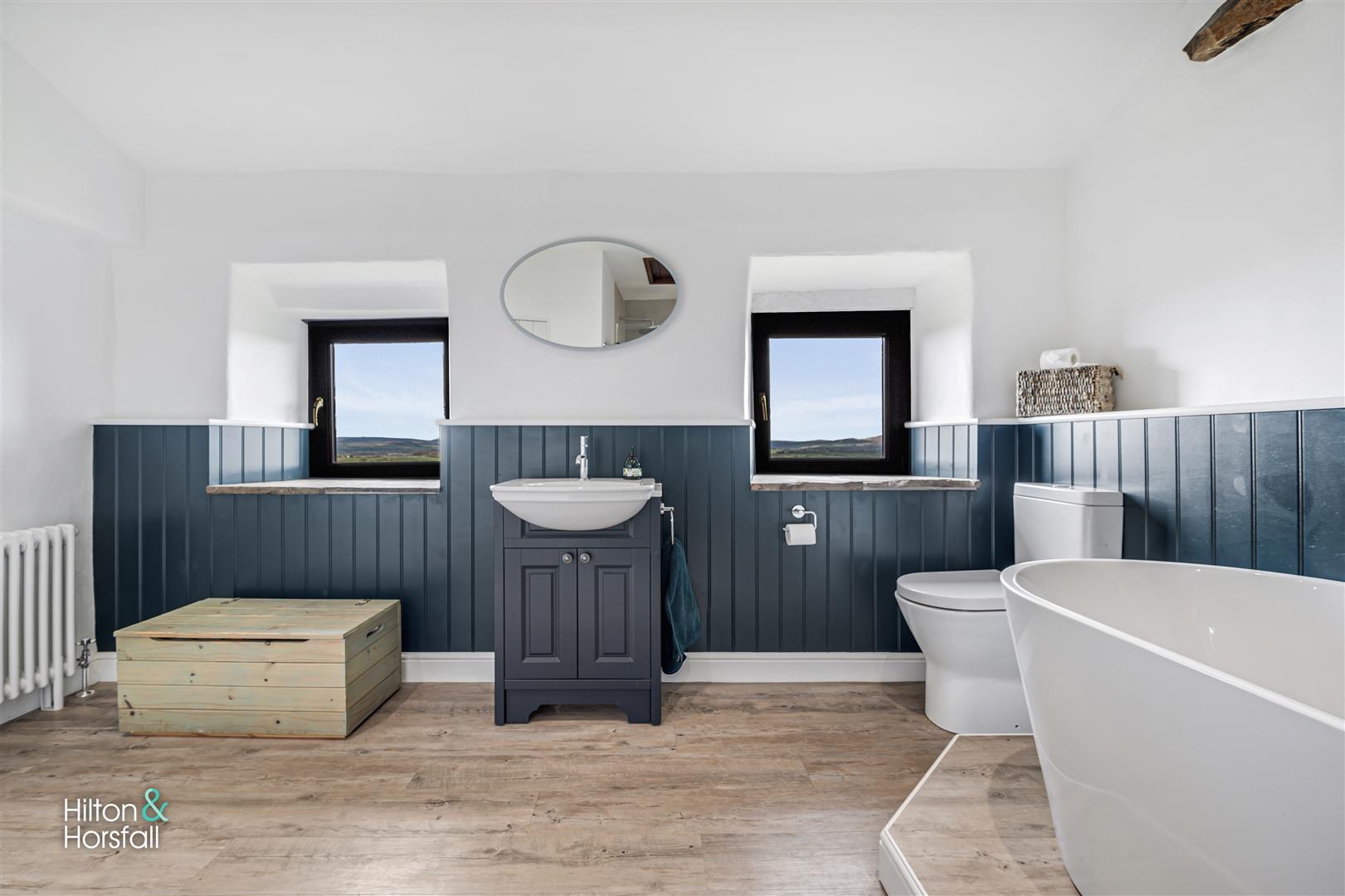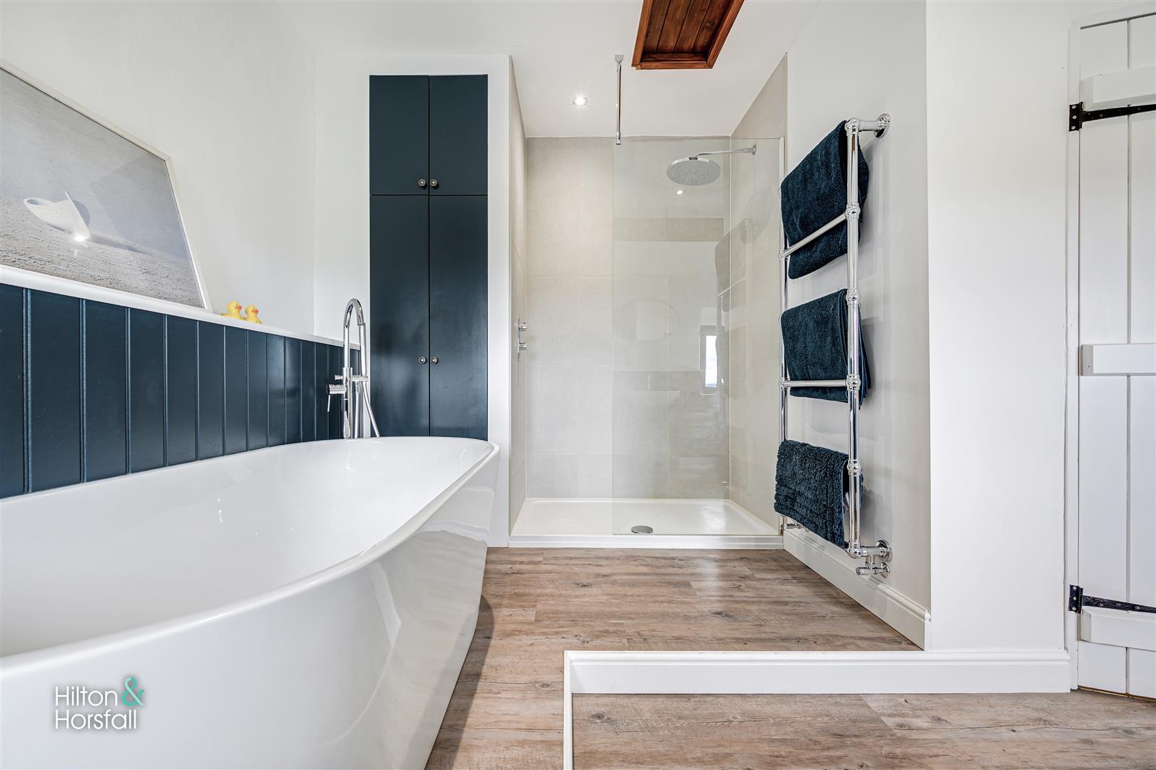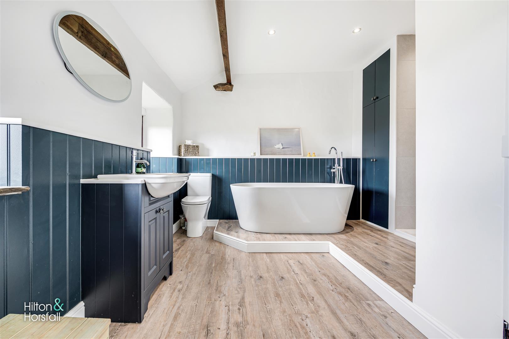 A stunning four piece bathroom suite comprising of: wood effect flooring, walk in shower cubicle with rainfall shower head, freestanding tubular bathtub with chrome mixer tap and shower attachment over, recessed LED spotlights, heated chrome towel rack, push button w.c, sink in vanity unit with chrome mixer tap, touch sensor LED light up mirror, cast iron radiator, exposed wood ceiling beams and composite double glazed window to the front elevation with stone sills.