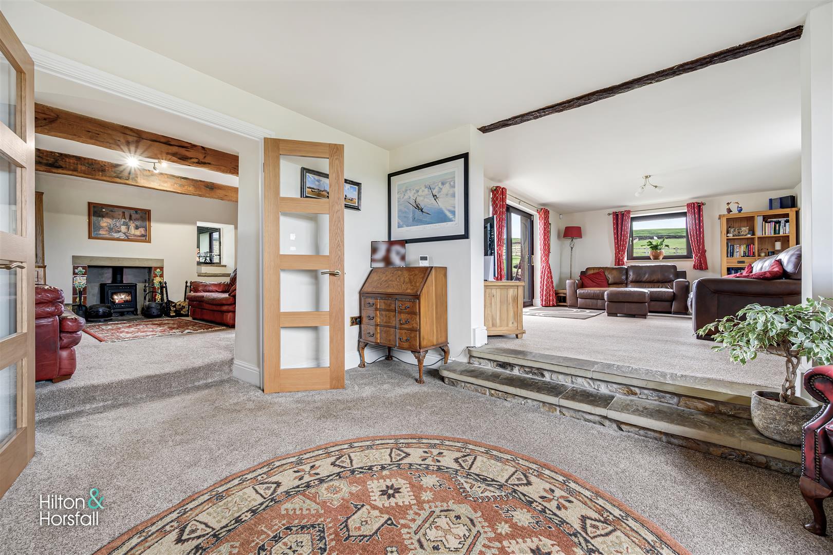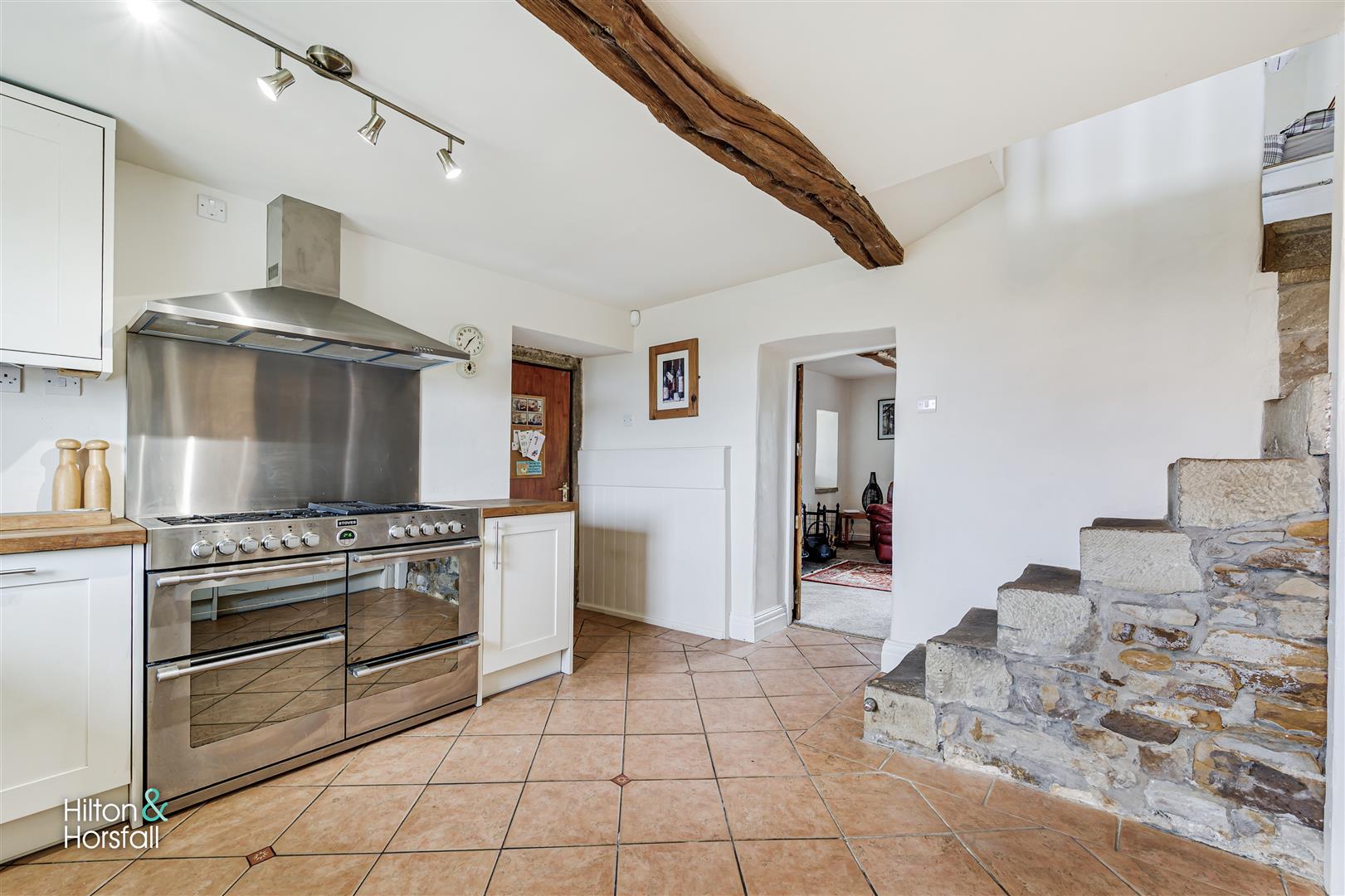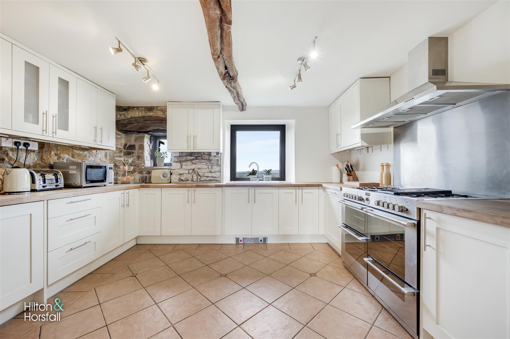 Offering a range of fitted wall and base units with contrasting worktops, tiled flooring, exposed wood ceiling beams, Stoves range cooker with chrome extractor hood above, Belfast sink with chrome mixer tap, exposed brick wall feature, Bosch dishwasher, serving hatch, stone staircase to the first floor / landing and composite windows to the front elevation with stunning panoramic views towards the countryside and Pendle Hill.