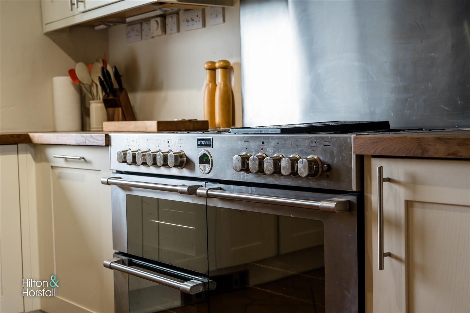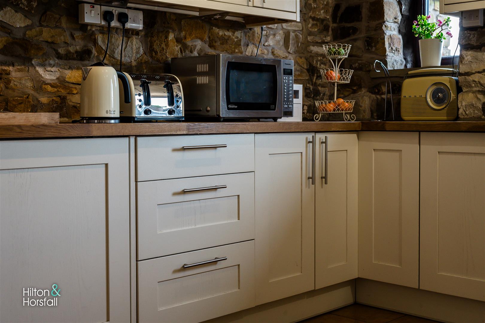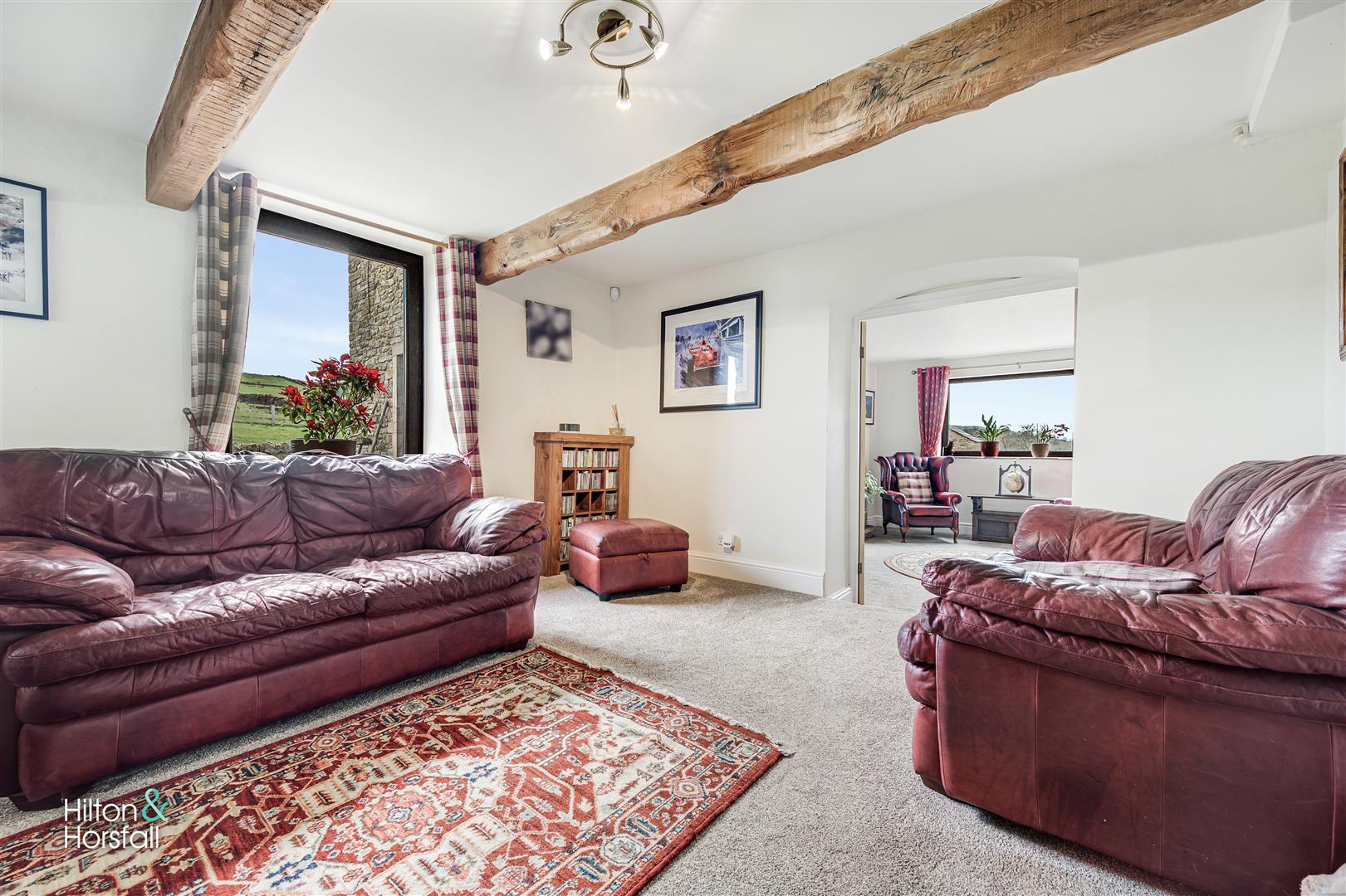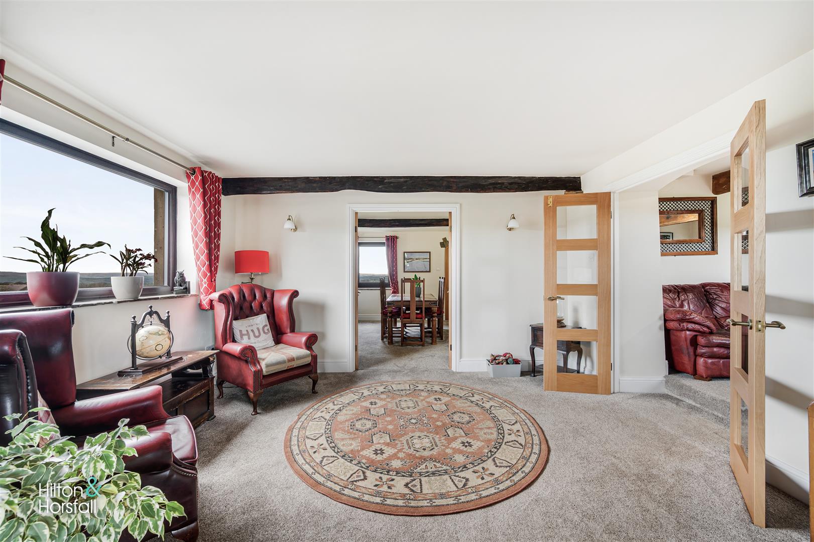 Offering a range of fitted wall and base units with contrasting worktops, tiled flooring, exposed wood ceiling beams, Stoves range cooker with chrome extractor hood above, Belfast sink with chrome mixer tap, exposed brick wall feature, Bosch dishwasher, serving hatch, stone staircase to the first floor / landing and composite windows to the front elevation with stunning panoramic views towards the countryside and Pendle Hill.