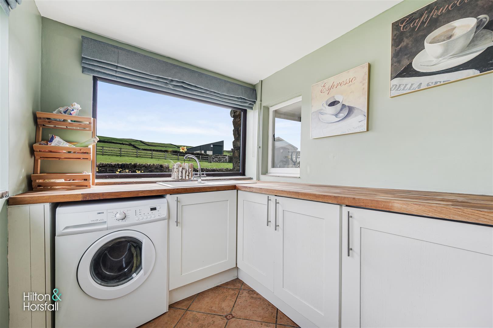 A useful utility room having tiled flooring, fitted wall and base units with contrasting worktops, inset sink with chrome mixer tap, space for an under counter fridge, plumbing for a washing machine, exposed wood ceiling beams, and composite double glazed window to the side and rear elevation.