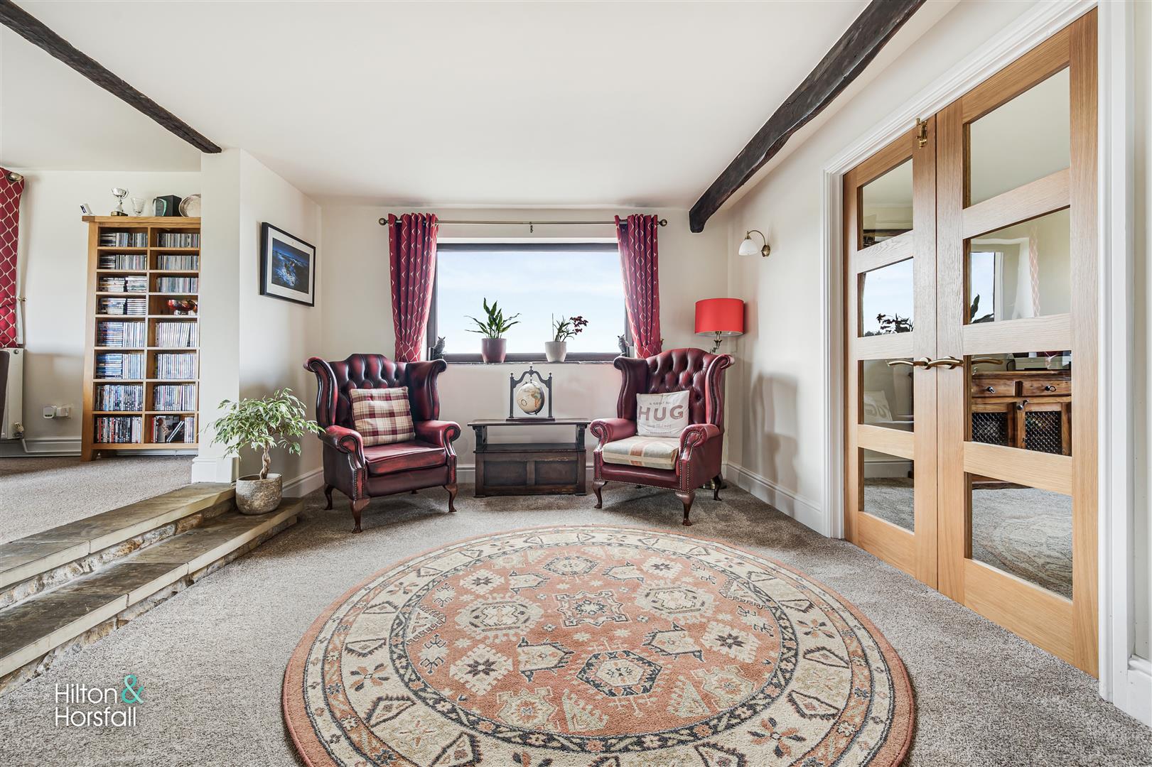 An additional sitting room with exposed wood ceiling beams, 2x wall lights, double doors leading through to dining room, composite double glazed window to the side elevation.