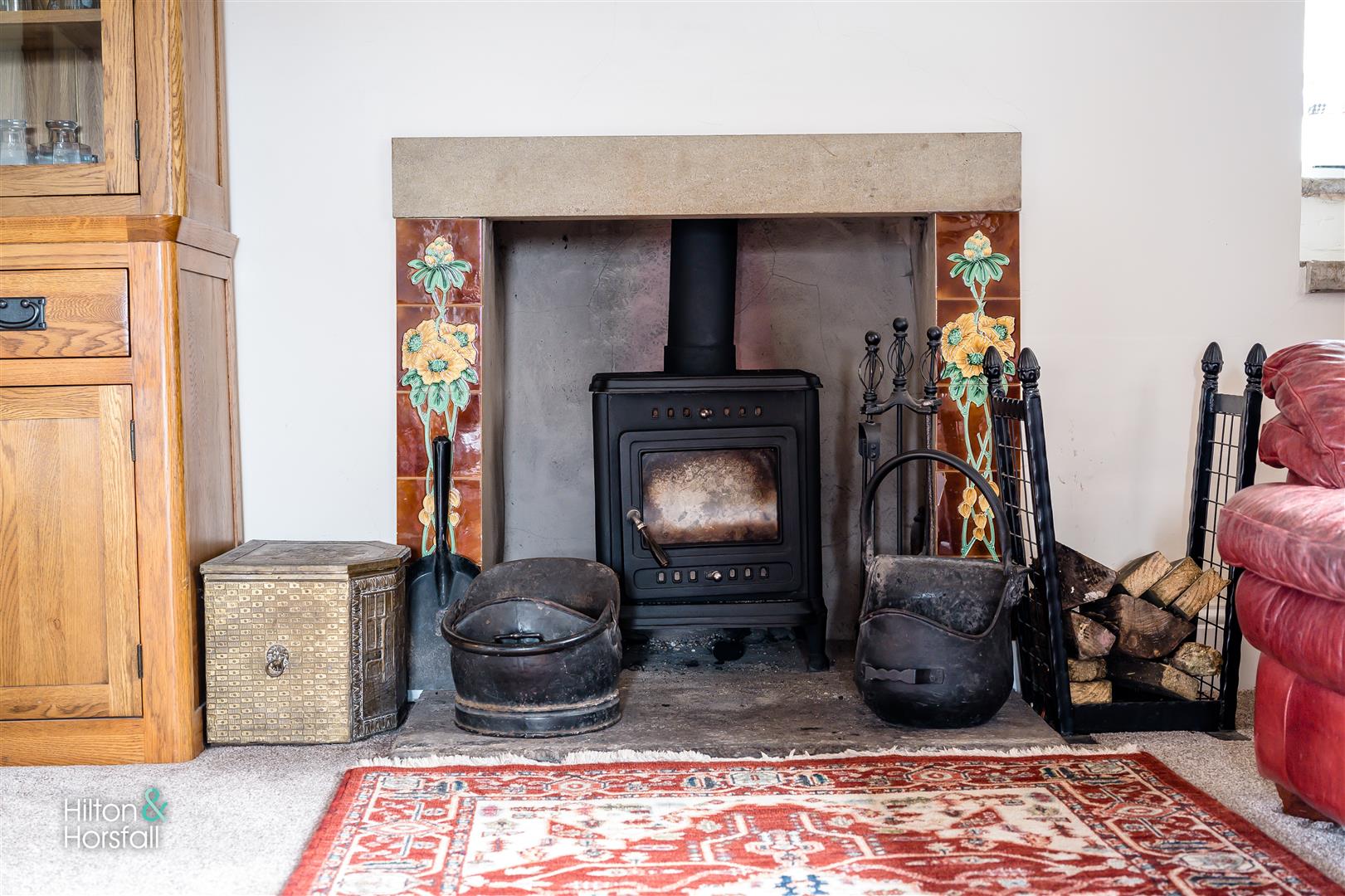 A cosy sitting room having space for settees, exposed wood ceiling beams, feature fireplace with log burning stove set within, double doors leading through to the additional sitting room and wood frame windows to the side and rear elevation.