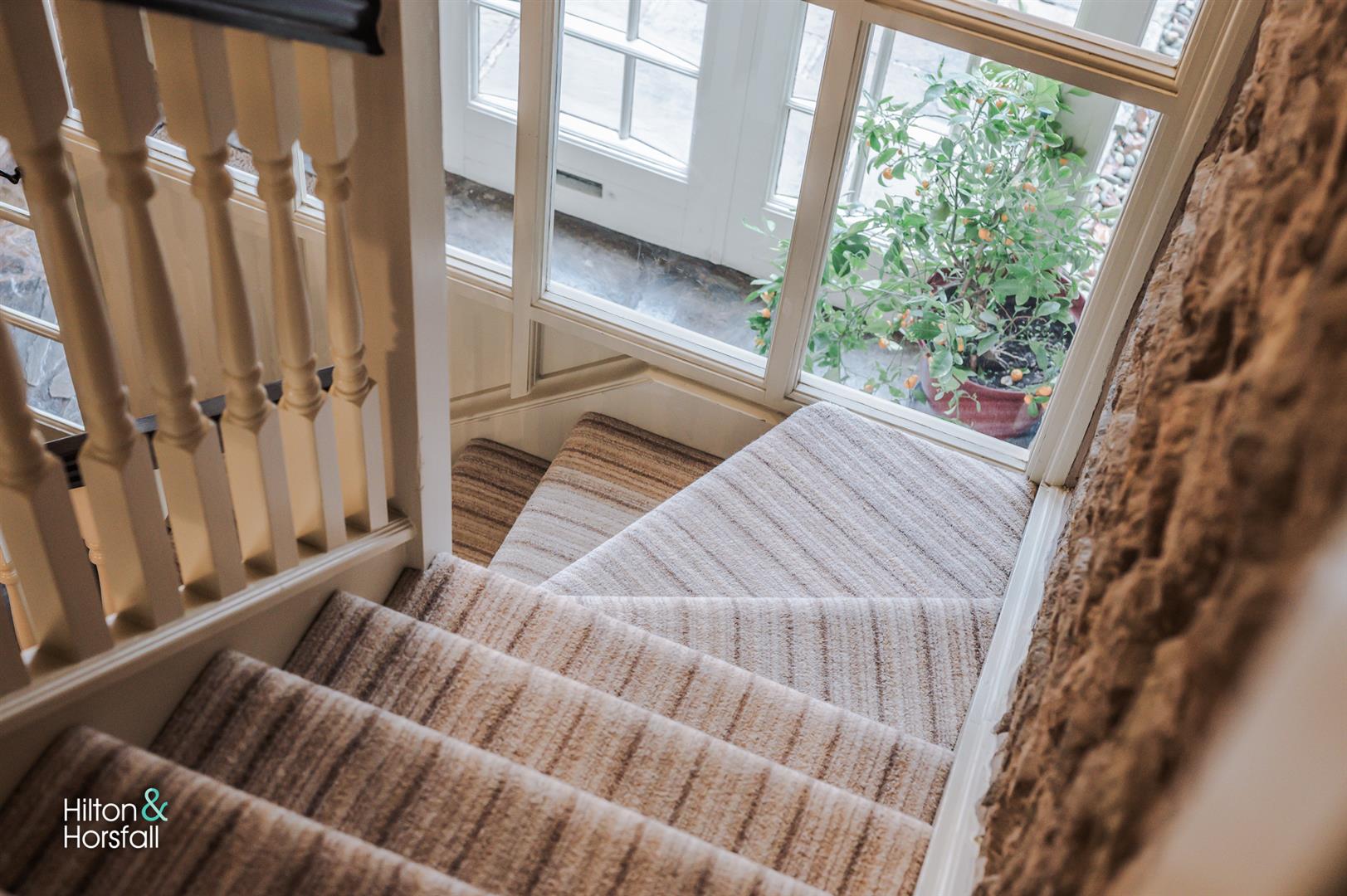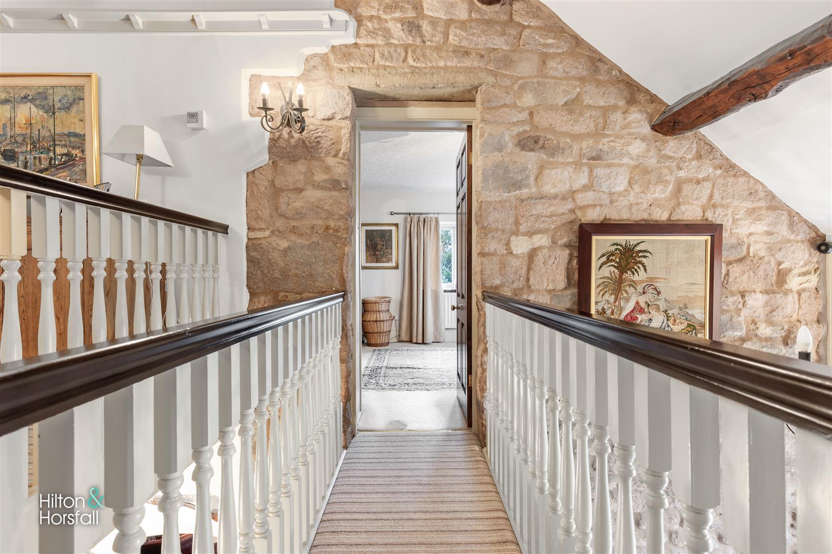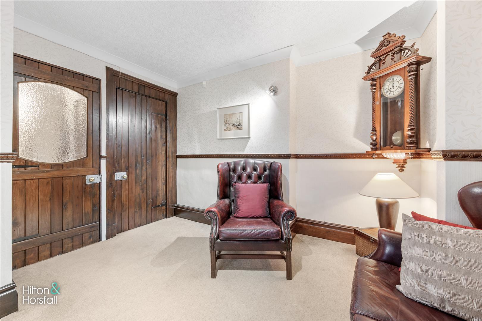 Having stone flagged flooring, exposed wood ceiling beams, dado rail, 2x wall lights, 1x central heating radiator and access to the rear staircase.