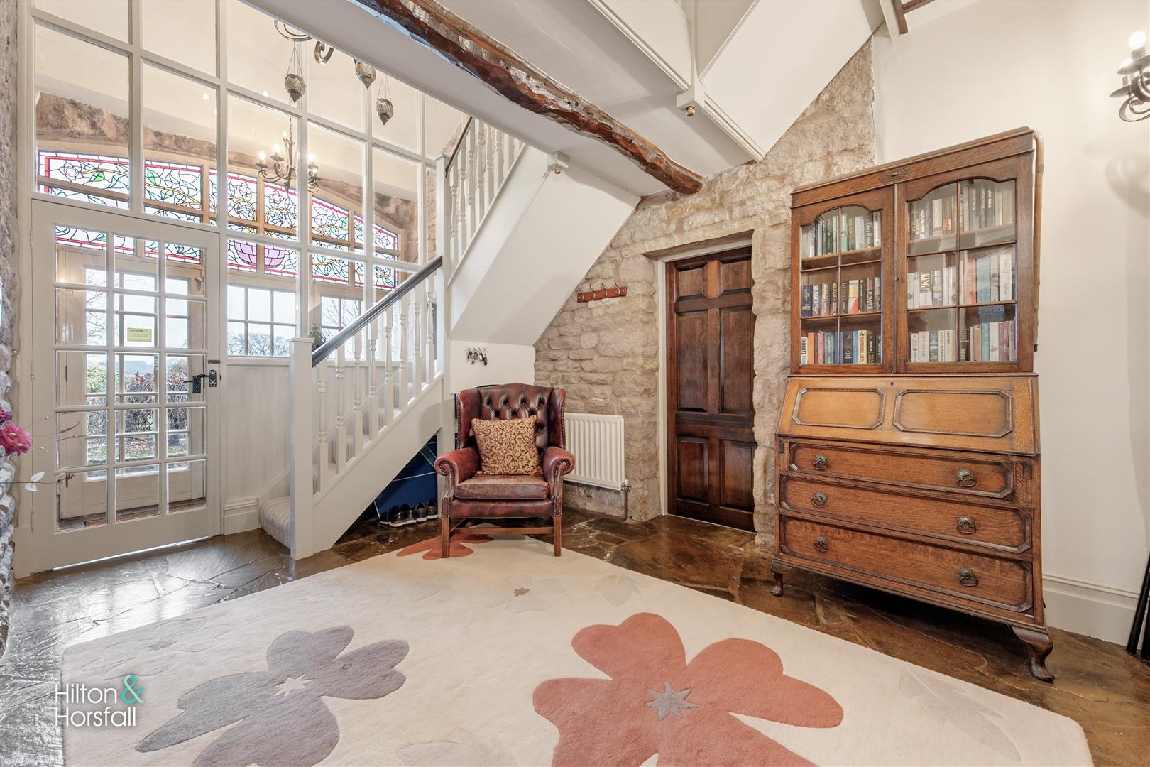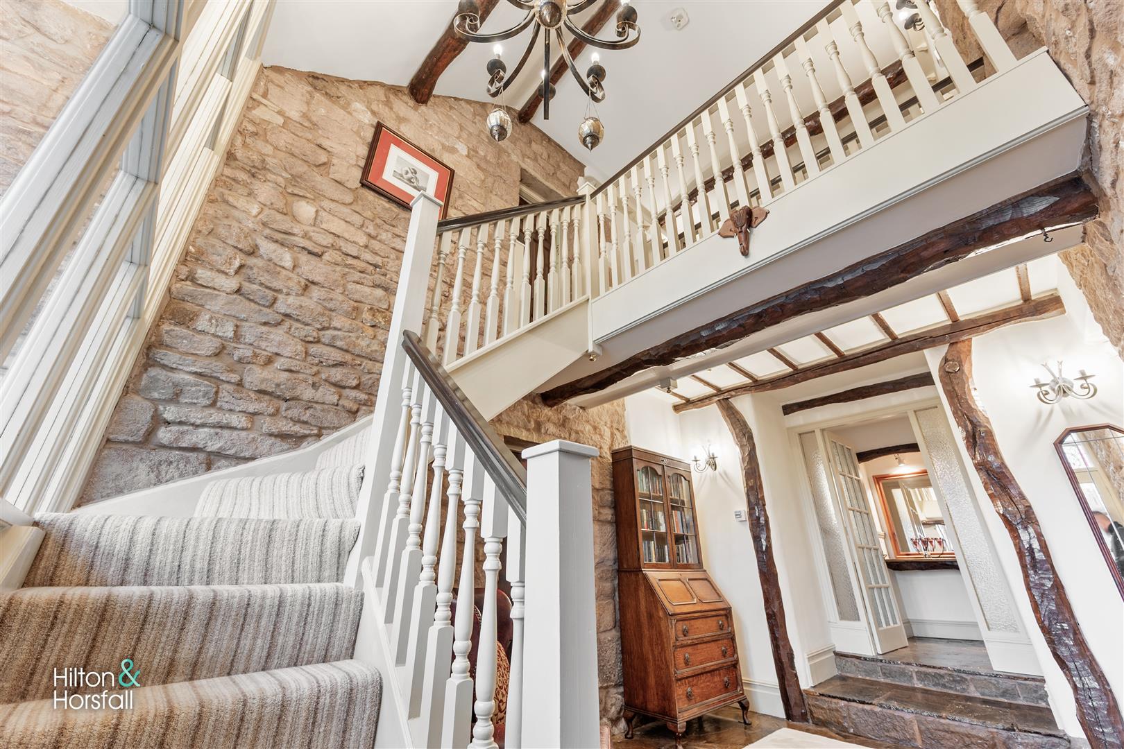 A welcoming entrance hallway with stone flagged flooring, vaulted ceiling, open balustrade staircase to the first floor with a gallery landing, exposed brick feature walls, exposed wood ceiling beams and a wood frame door with a frosted glass panel leading through to the inner hallway.