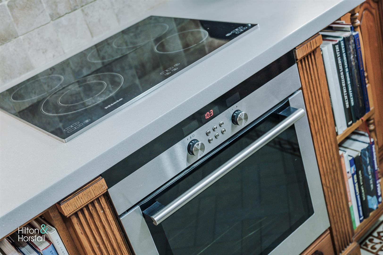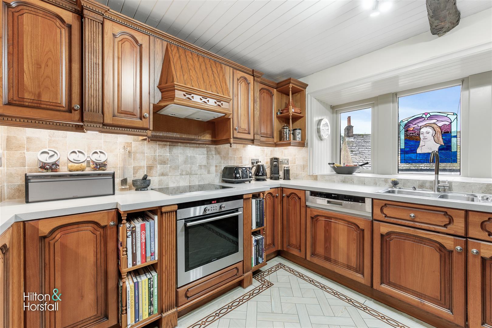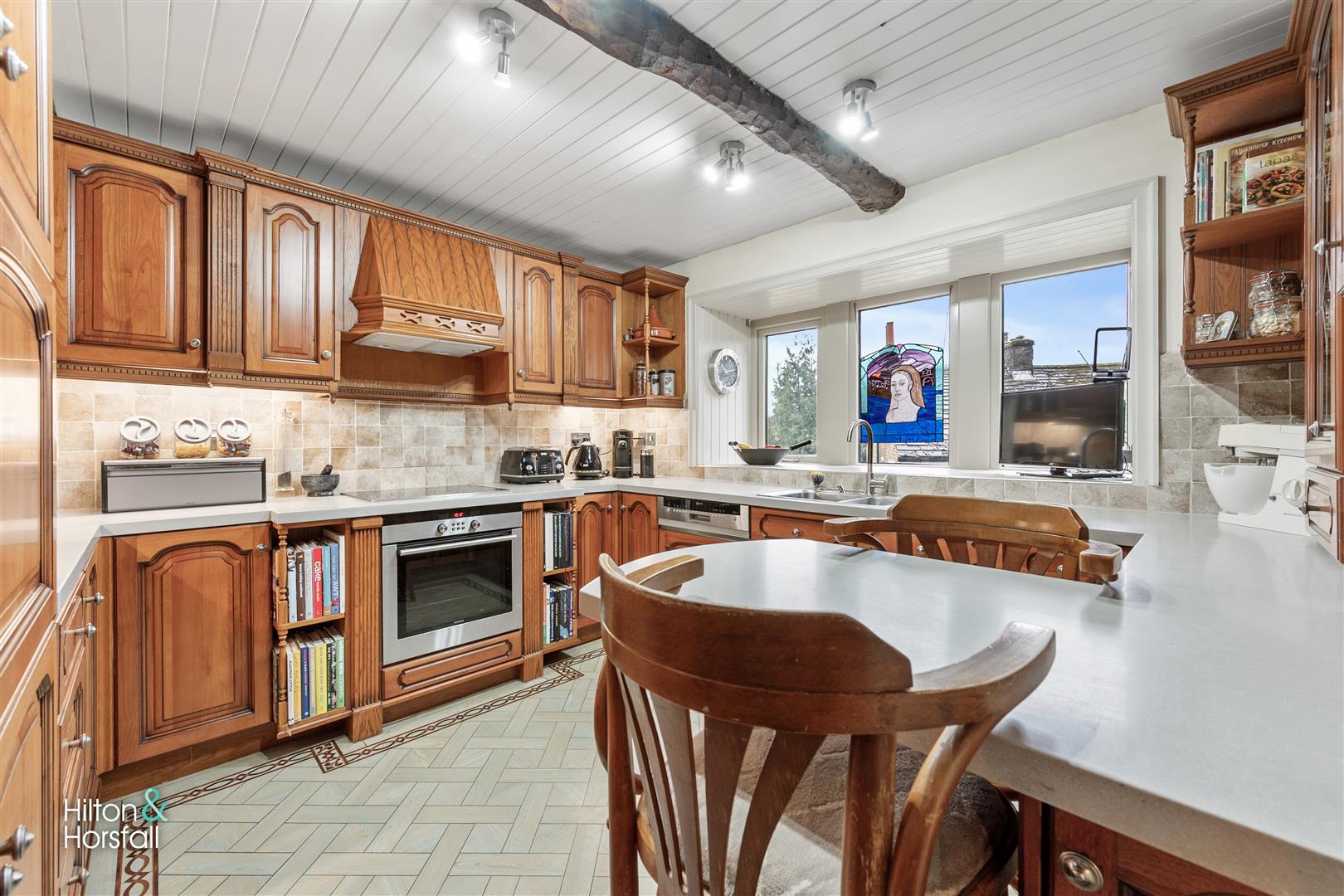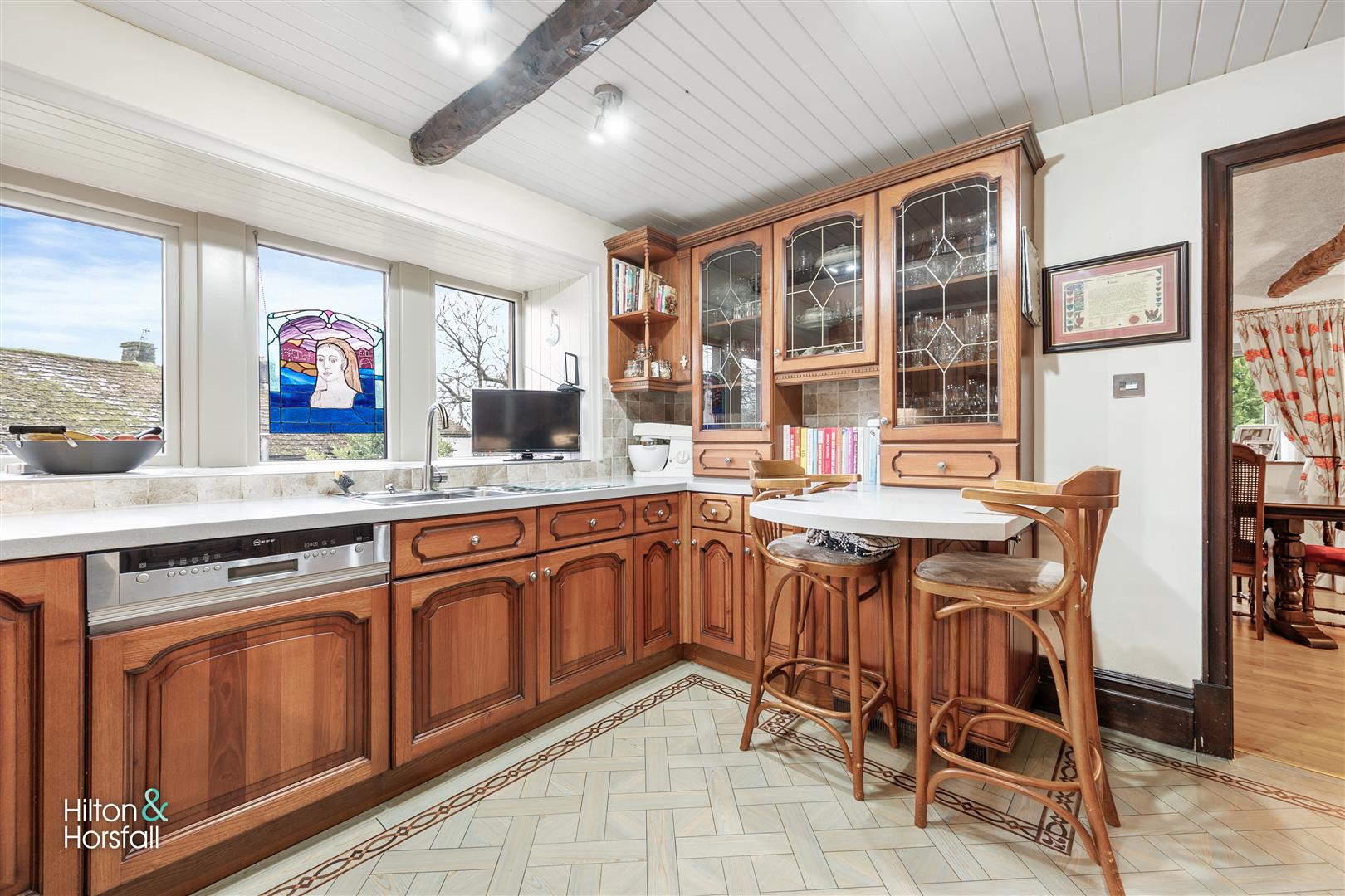 Offering a range of fitted wall and base units with contrasting worktops, tiled splash back, inset sink with chrome mixer tap, exposed wood ceiling beams, integrated 60 / 40 fridge/freezer, under counter LED lighting, integrated Siemens oven / grill, Miele 4 ring induction hob with extractor fan above, integrated NEFF dishwasher and wood frame window to the side elevation.