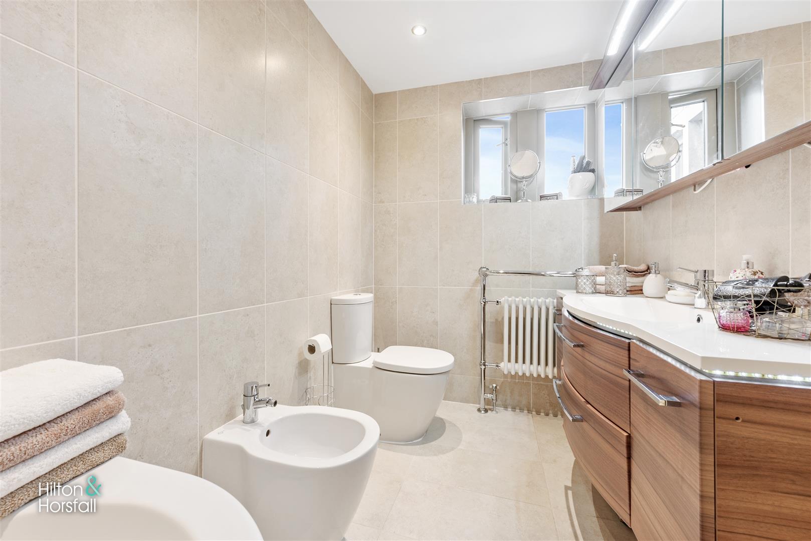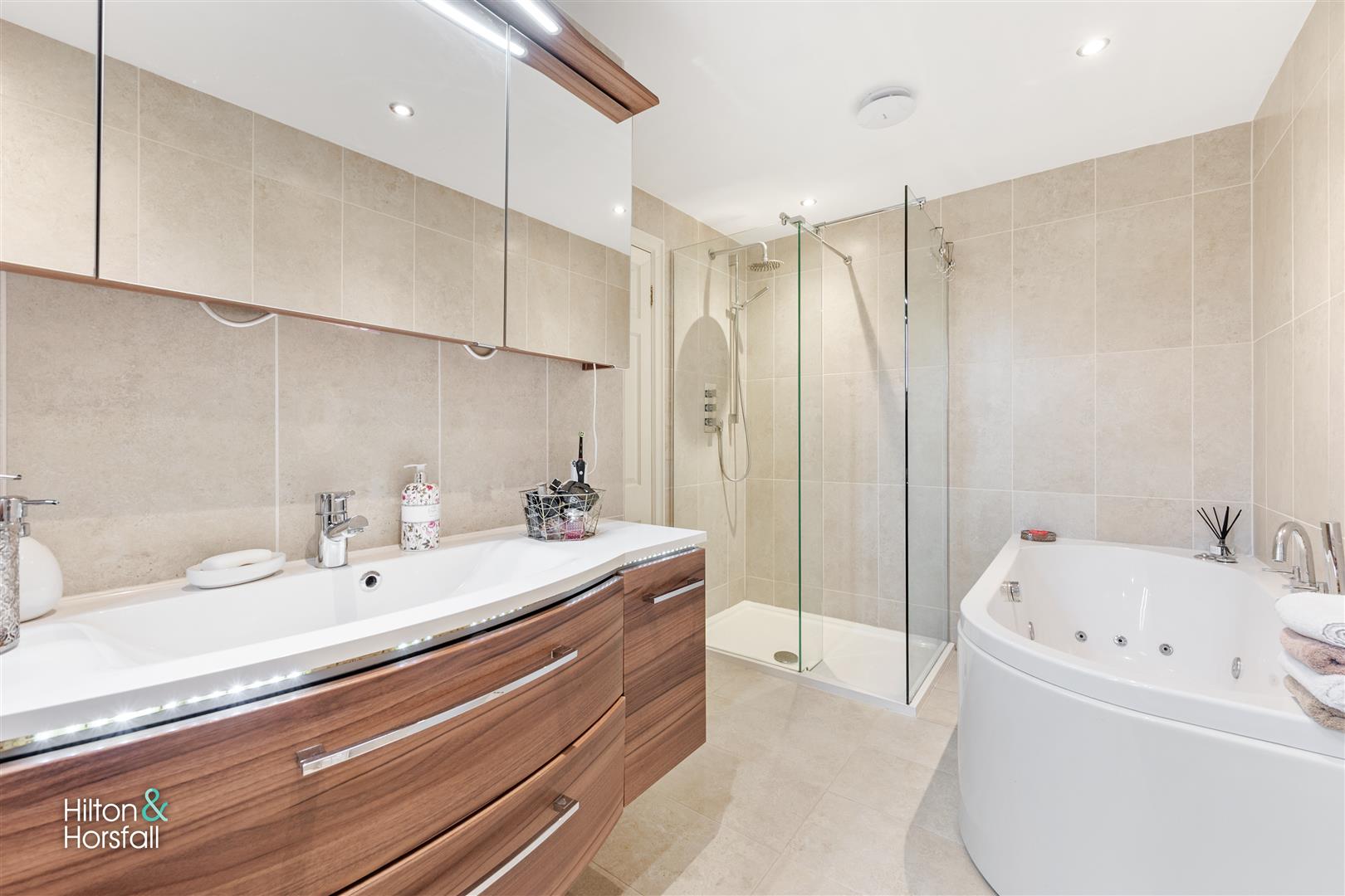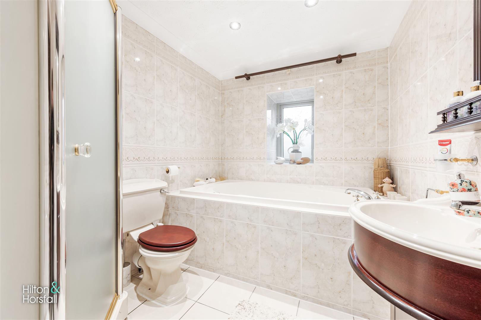 A contemporary four piece bathroom suite comprising of: tiled flooring and walls, ceiling coving, recessed LED spotlights, corner shower cubicle, panelled bathtub, low level w.c, sink in vanity unit, ceiling coving, 1x central heating radiator, chrome towel rack, air extraction fan and window to the side elevation.