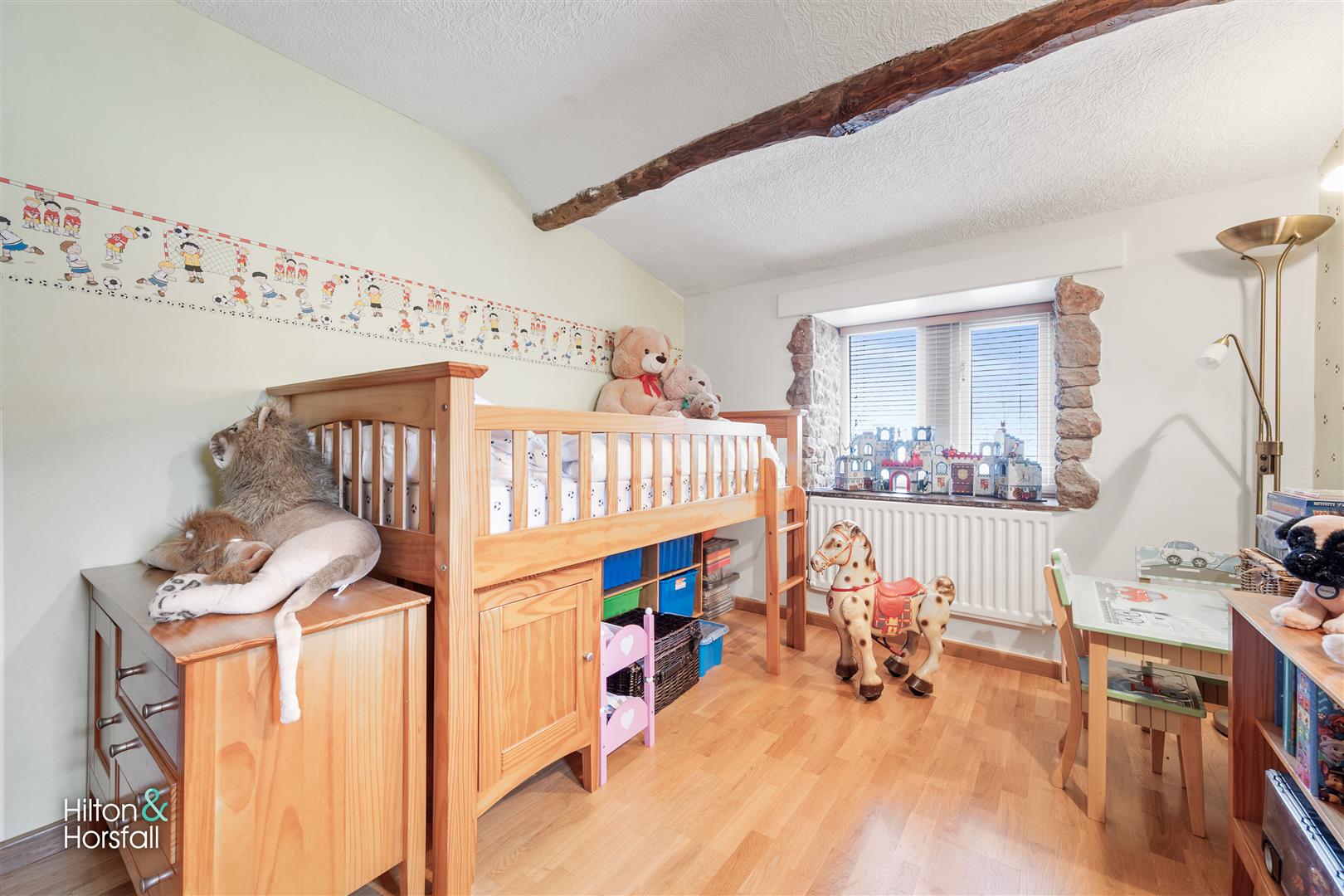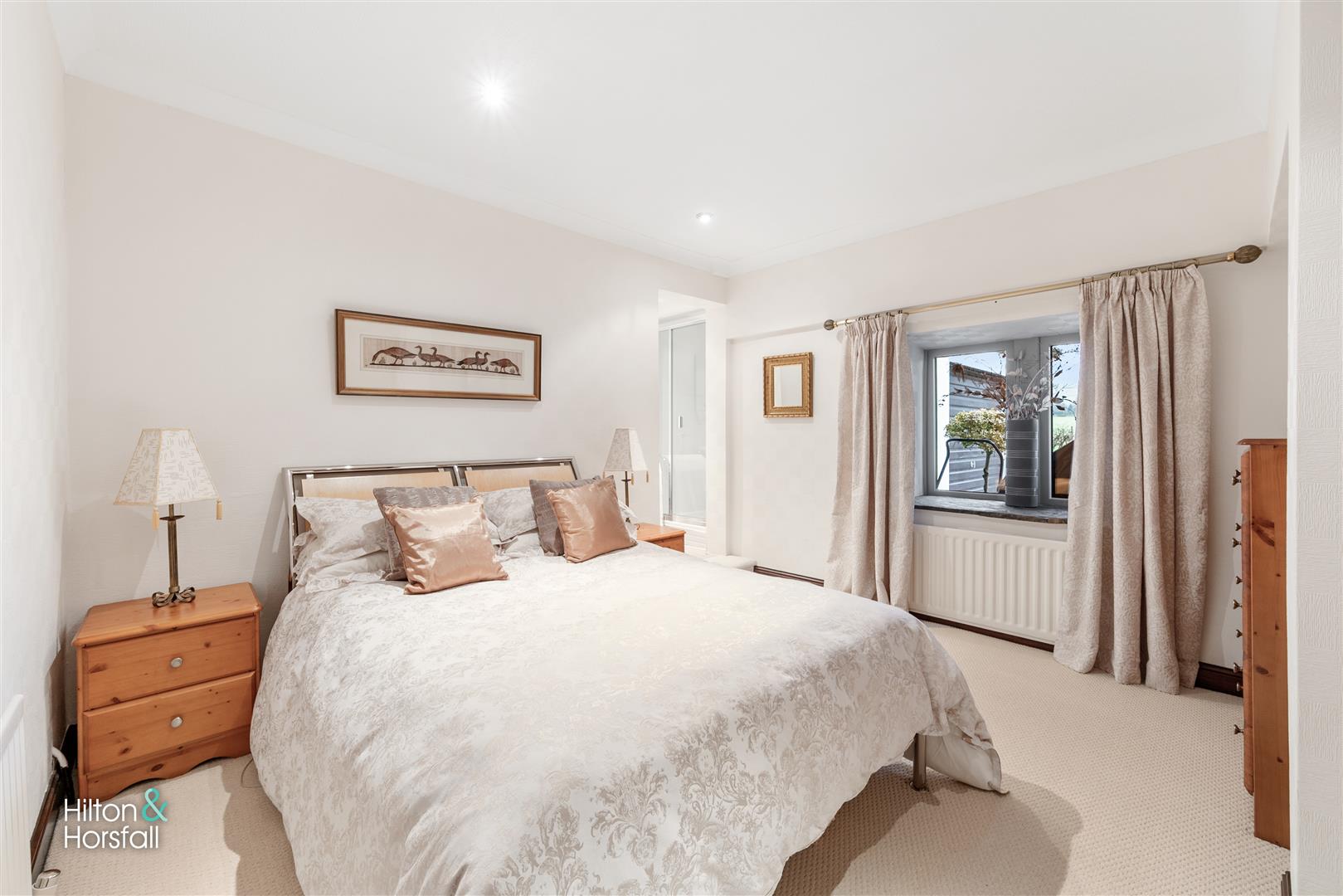 Yet again a bedroom of double proportions with space for wardrobes and drawers, exposed wood ceiling beams, 2x wall lights, 1x central heating radiator and wood frame window to the side elevation with stone sills.