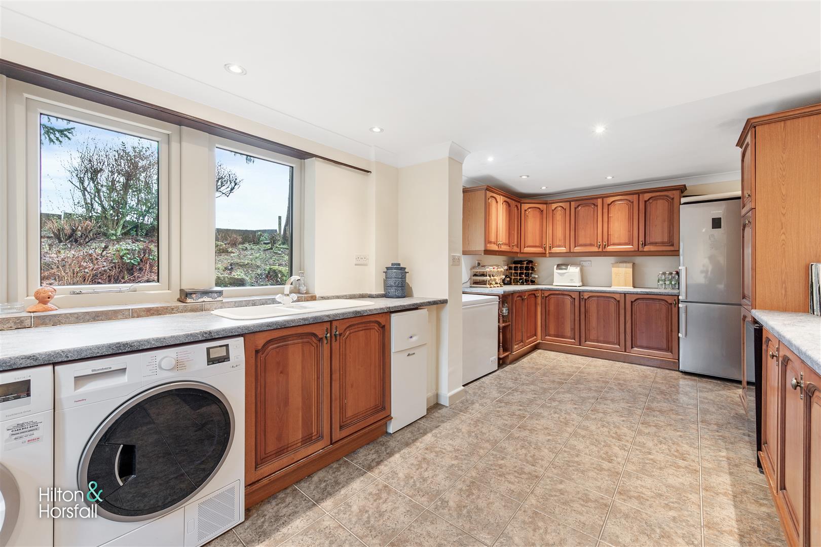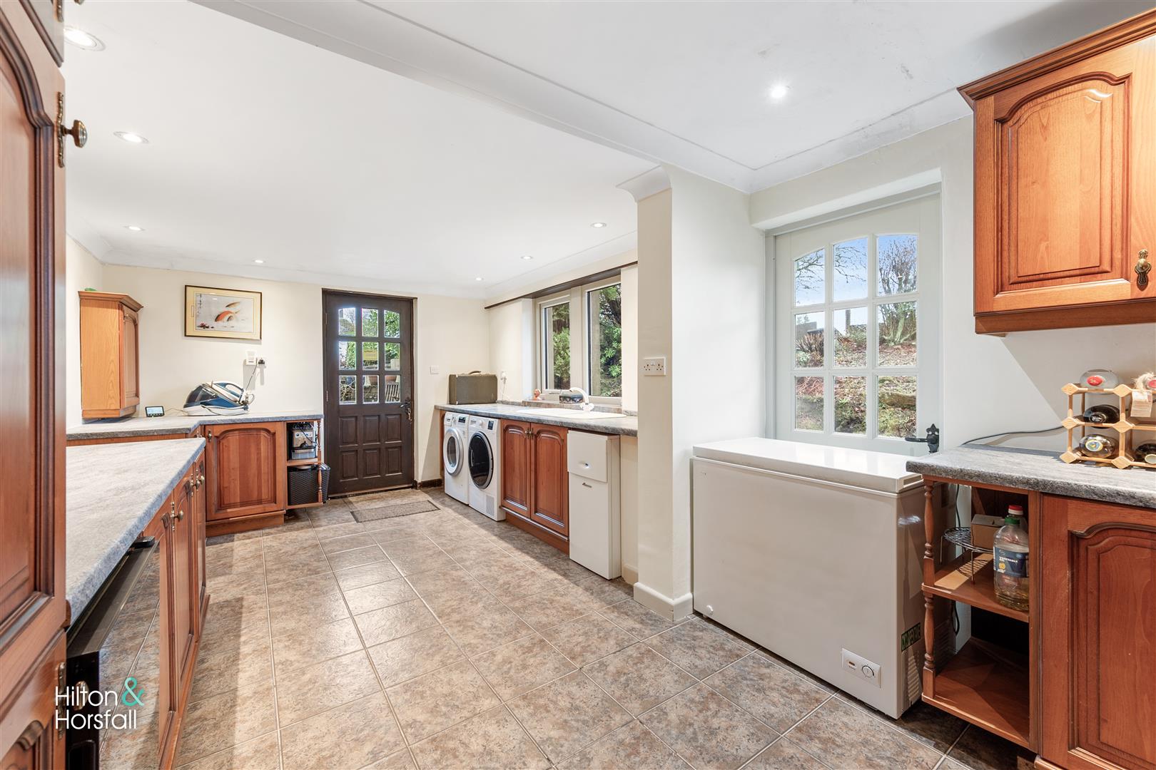 Having fitted wall and base units with contrasting worktops, tiled flooring, plumbing for a washing machine, space for a tumble dryer, recessed LED spotlights, ceiling coving, inset sink, integrated wine cooler, space for a freestanding fridge / freezer, housing Worcester boiler, wood frame window to the rear elevation and door leading through to the integral garage.