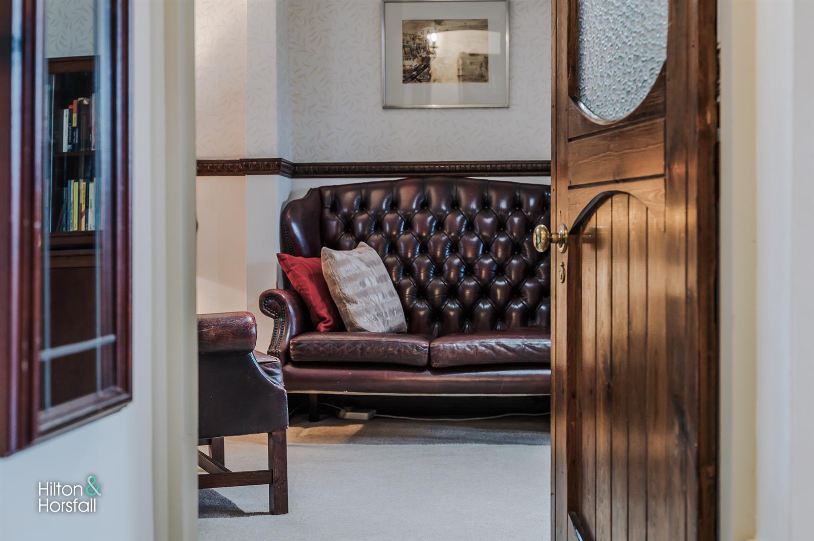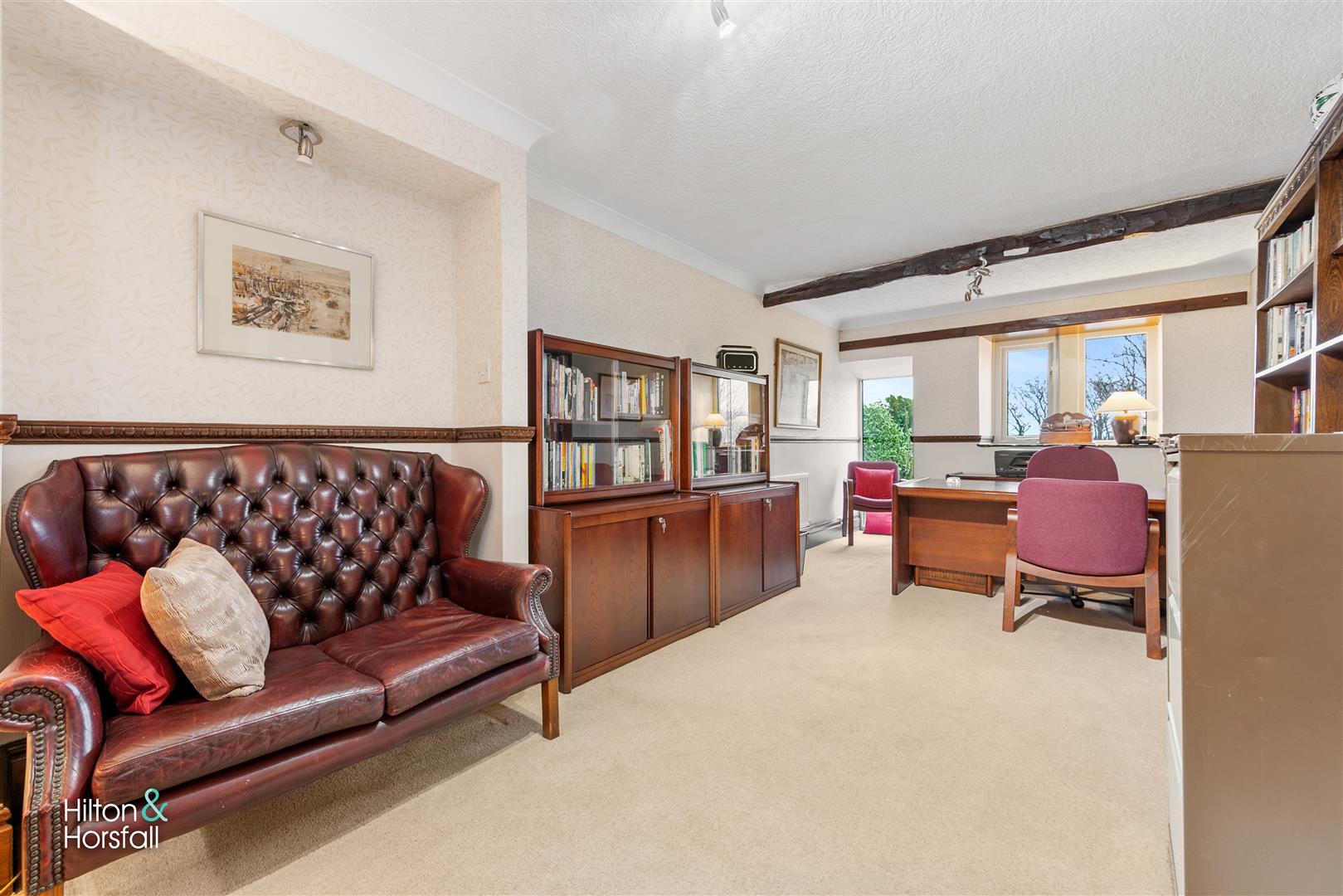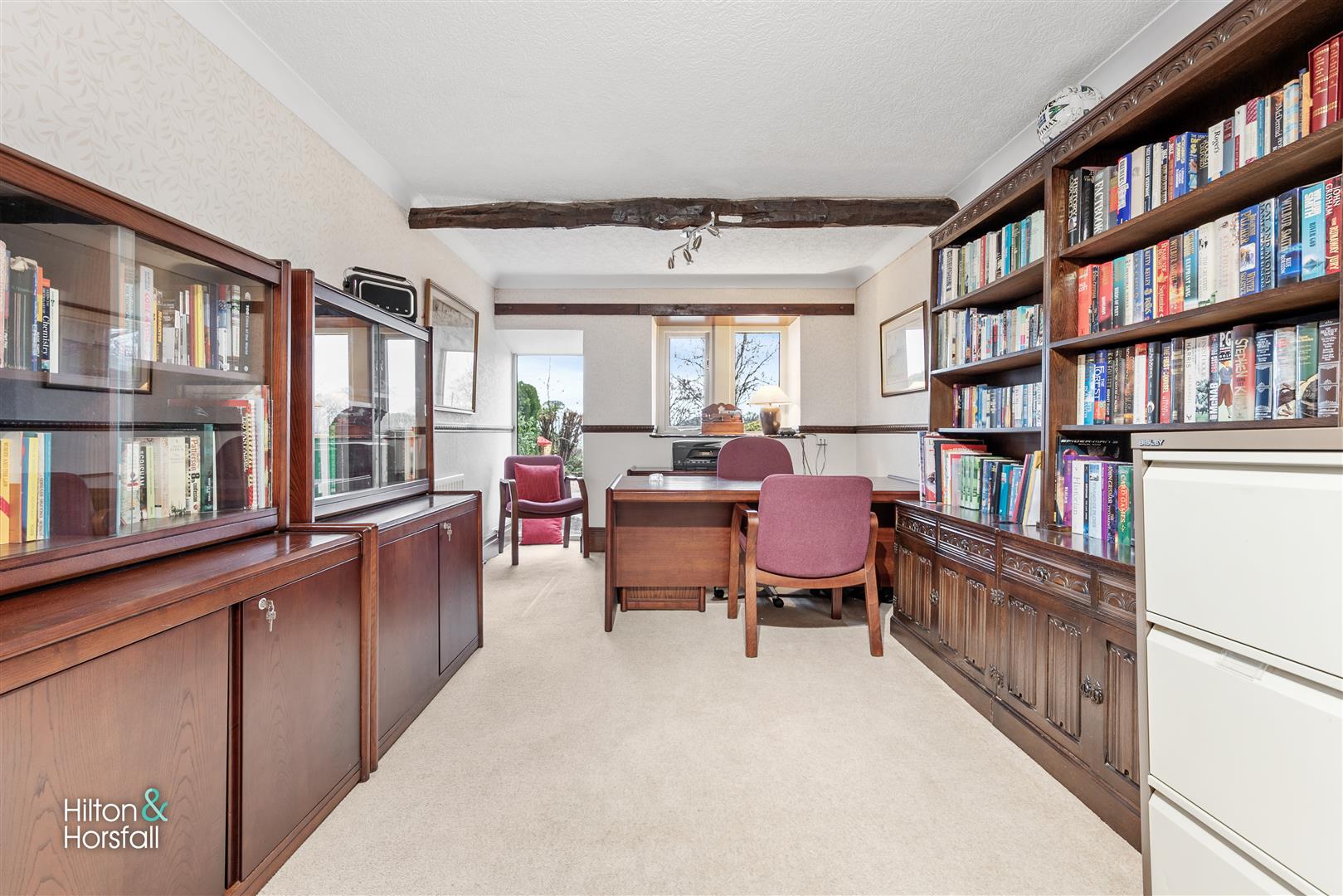 A large space currently utilised as an office room having ceiling coving, exposed wood ceiling beams, space for desk and chairs, 2x central heating radiators, door to airing cupboard, dado rail and double glazed window to the front elevation
