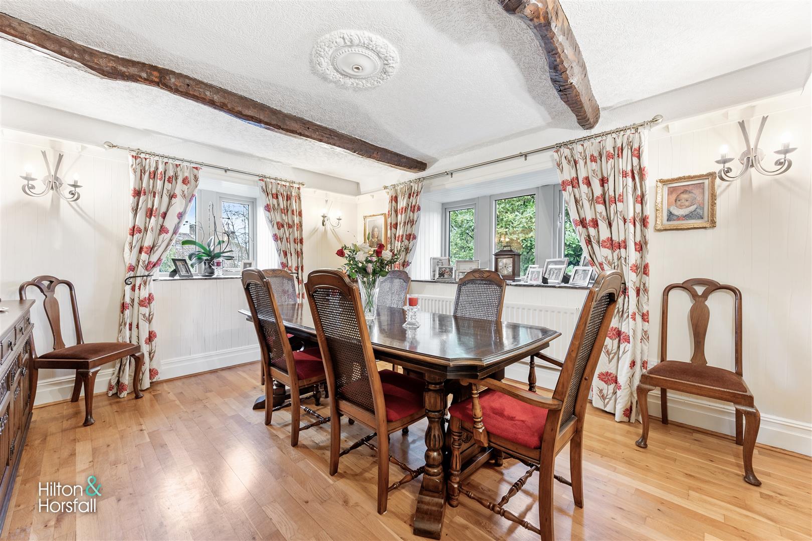 Ideal for hosting this dining room comprises of: space for table and chairs, wood flooring, exposed wood ceiling beams, 1x central heating radiator, door to living room and kitchen and wood frame window to the side and rear elevation with stone sills.