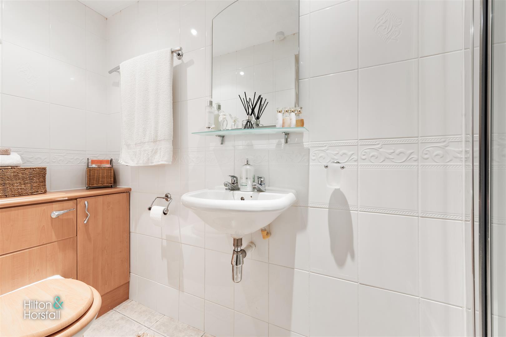 An en-suite shower room comprising of: tiled flooring and walls, shower cubicle, wall mounted sink, low level w.c, heated chrome towel rack, air extraction fan and recessed LED spotlights.