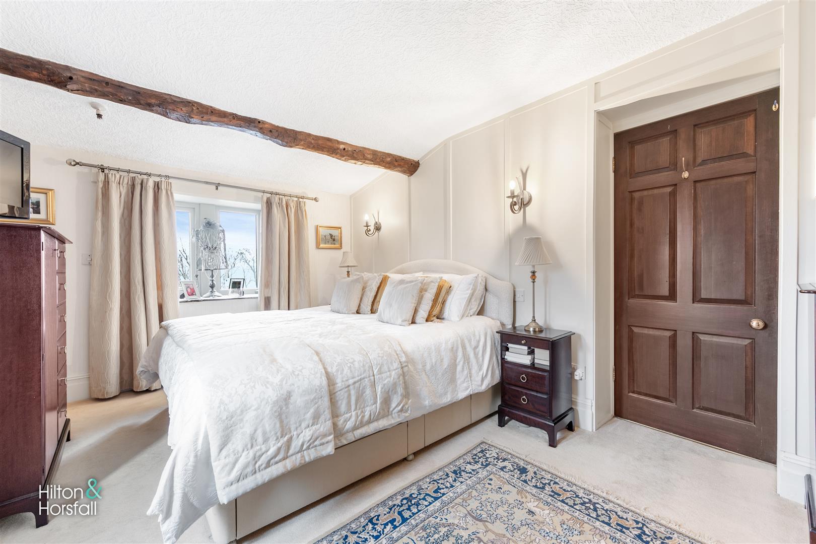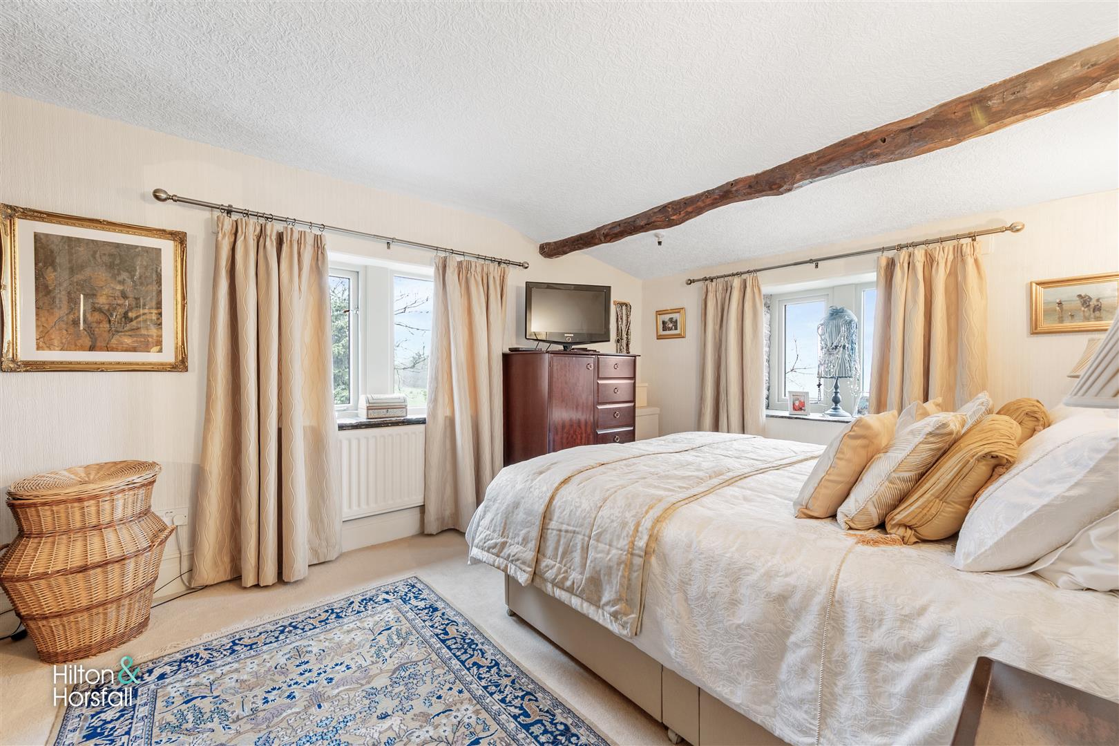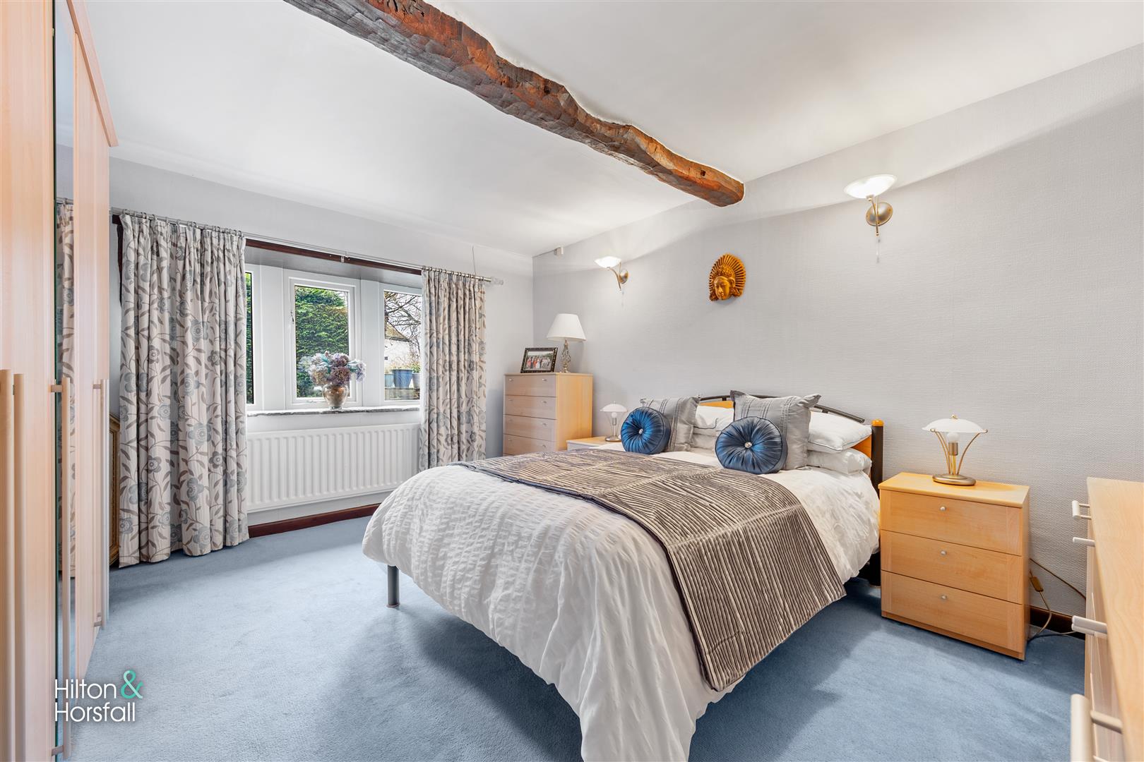 A bedroom of double proportions with space for wardrobes and drawers, exposed wood ceiling beams, 1x central heating radiator, wood frame window to the side and front elevation and access to the en-suite.