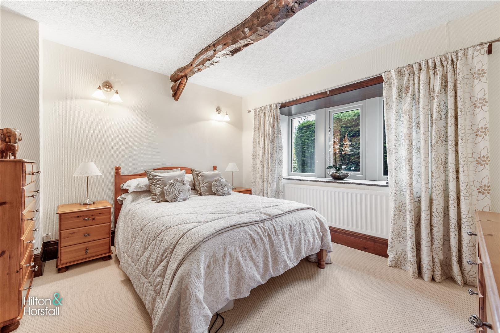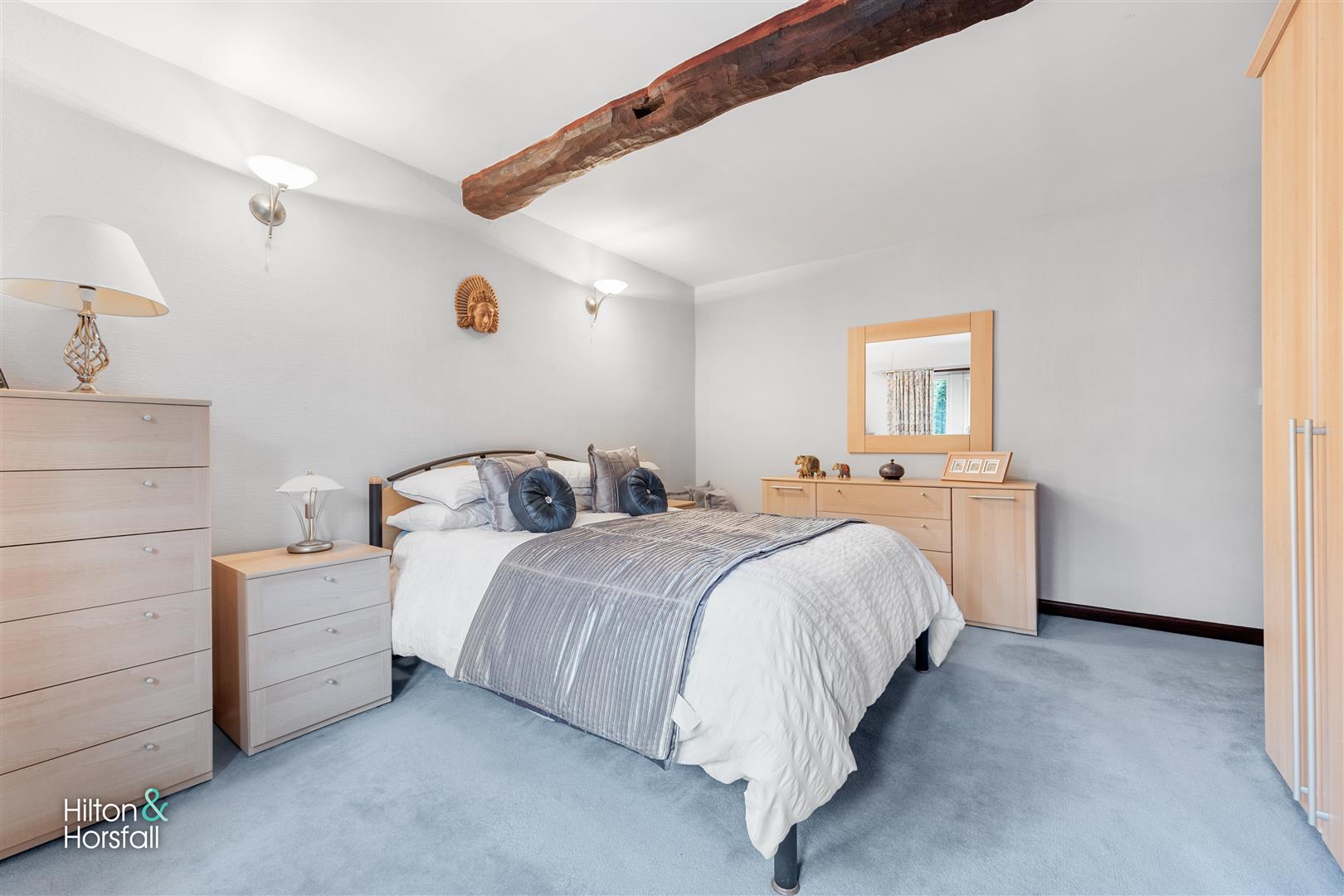 Another bedroom of double proportions with space for freestanding wardrobes and drawers, double doors to integrated wardrobe space, 2x wall lights, exposed wood ceiling beams, 1x central heating radiator and wood frame window to the side elevation with stone sills.