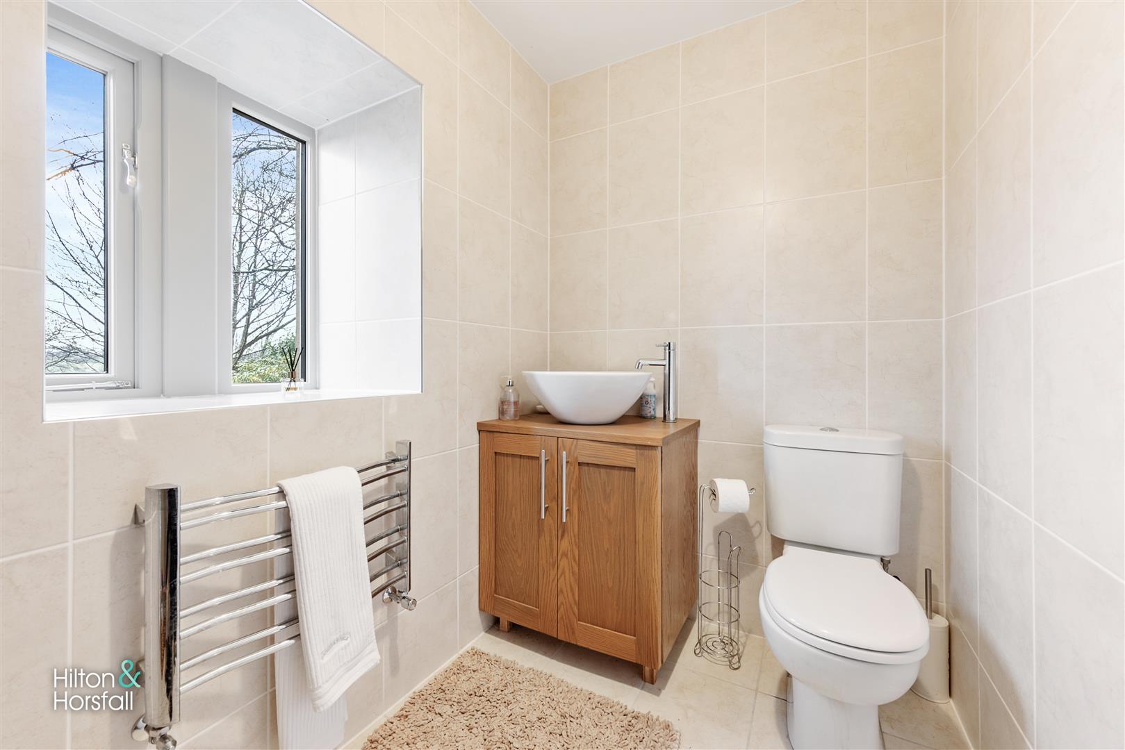 A useful ground floor w.c comprising of: tiled flooring and walls, push button w.c, wash basin on vanity unit with chrom mixer tap, exposed wood ceiling beam, heated chrome towel rack and double glazed window to the front elevation.