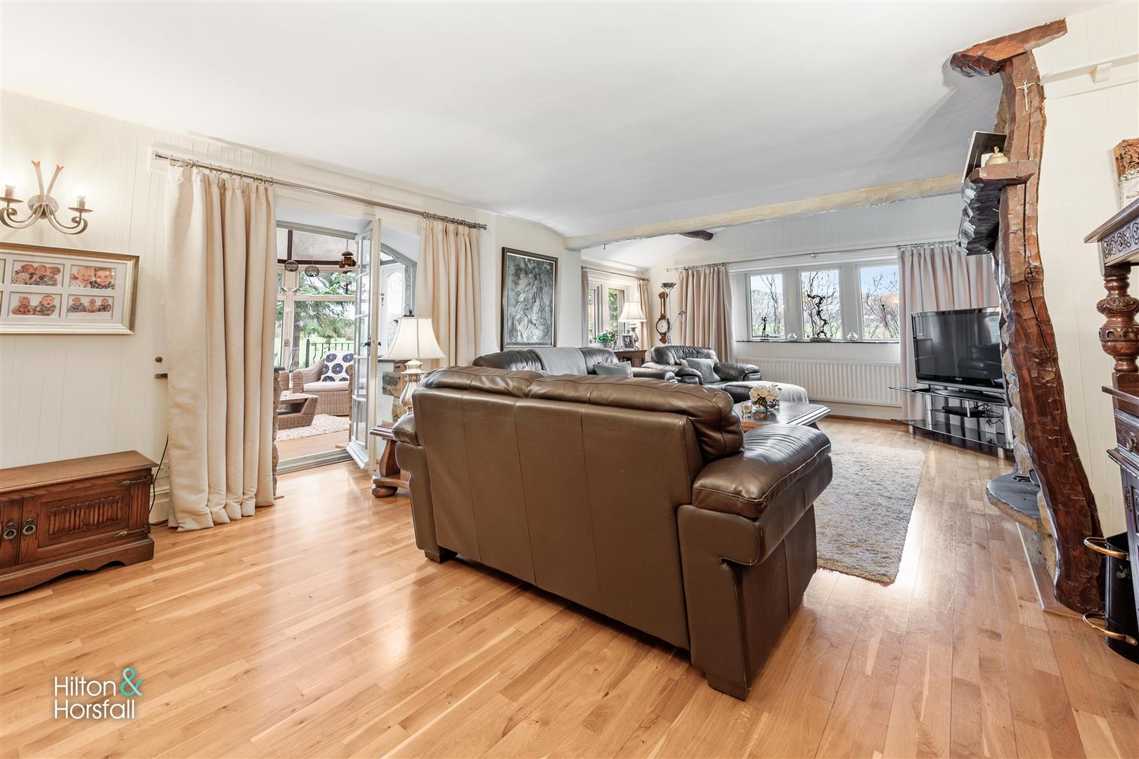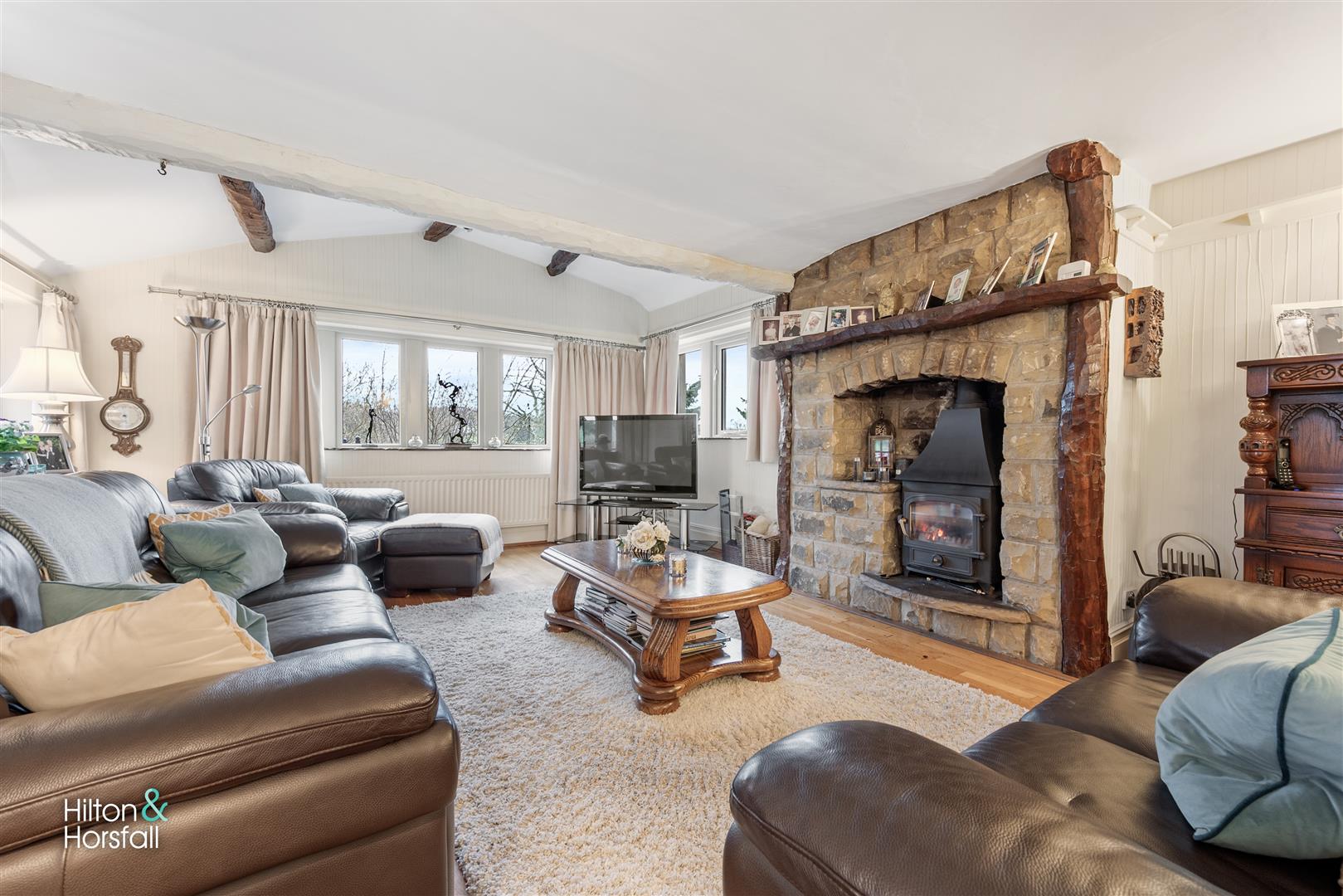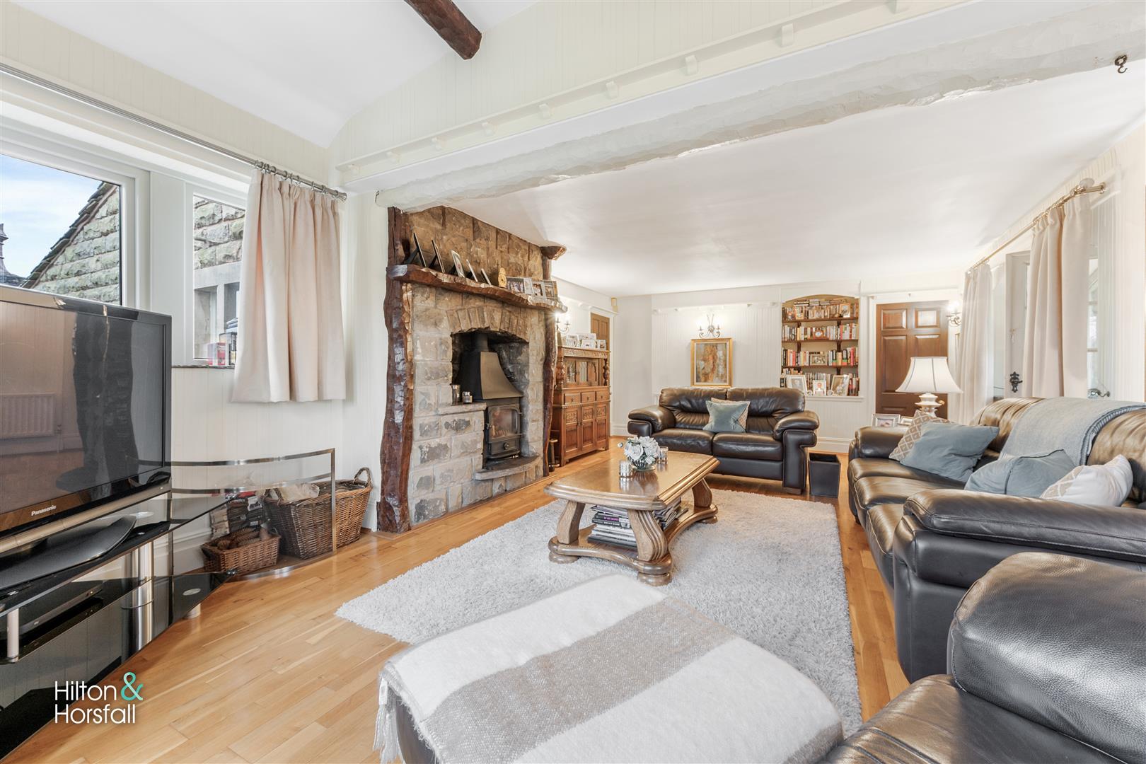 A family sized living room having wood flooring, space for settees, television point, 2x central heating radiators, exposed brick feature fireplace with coal burning stove set within, exposed wood ceiling beams, door to dining room, wood frame door with glass panel leading through to the sunroom and wood frame windows to the rear and side elevation with stone sills.