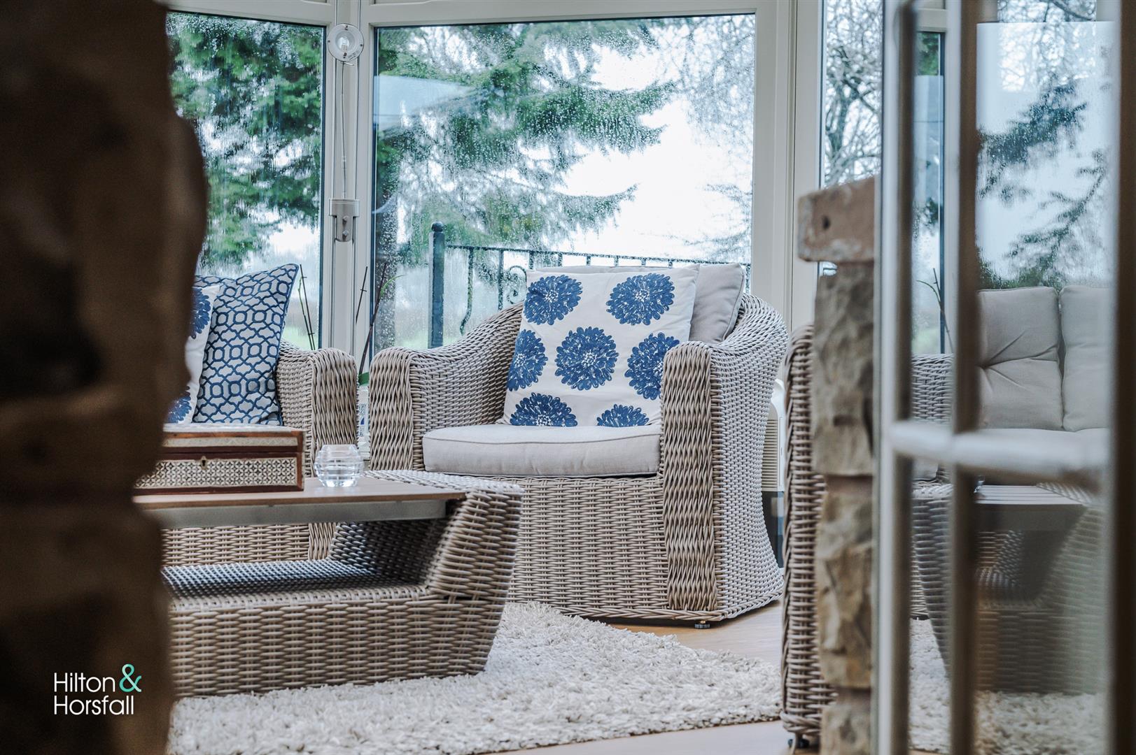A bright and airy sunroom with wood flooring, space for furniture, exposed brick feature wall, 1x electric radiator, wood frame windows offering far reaching open aspect views towards the countryside and wood frame door leading out to the balcony.