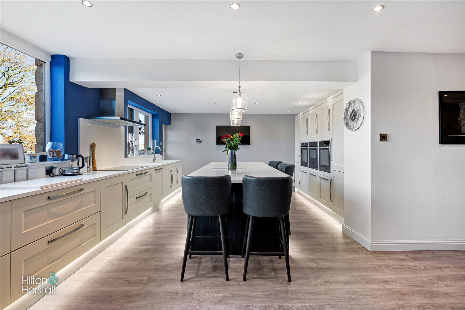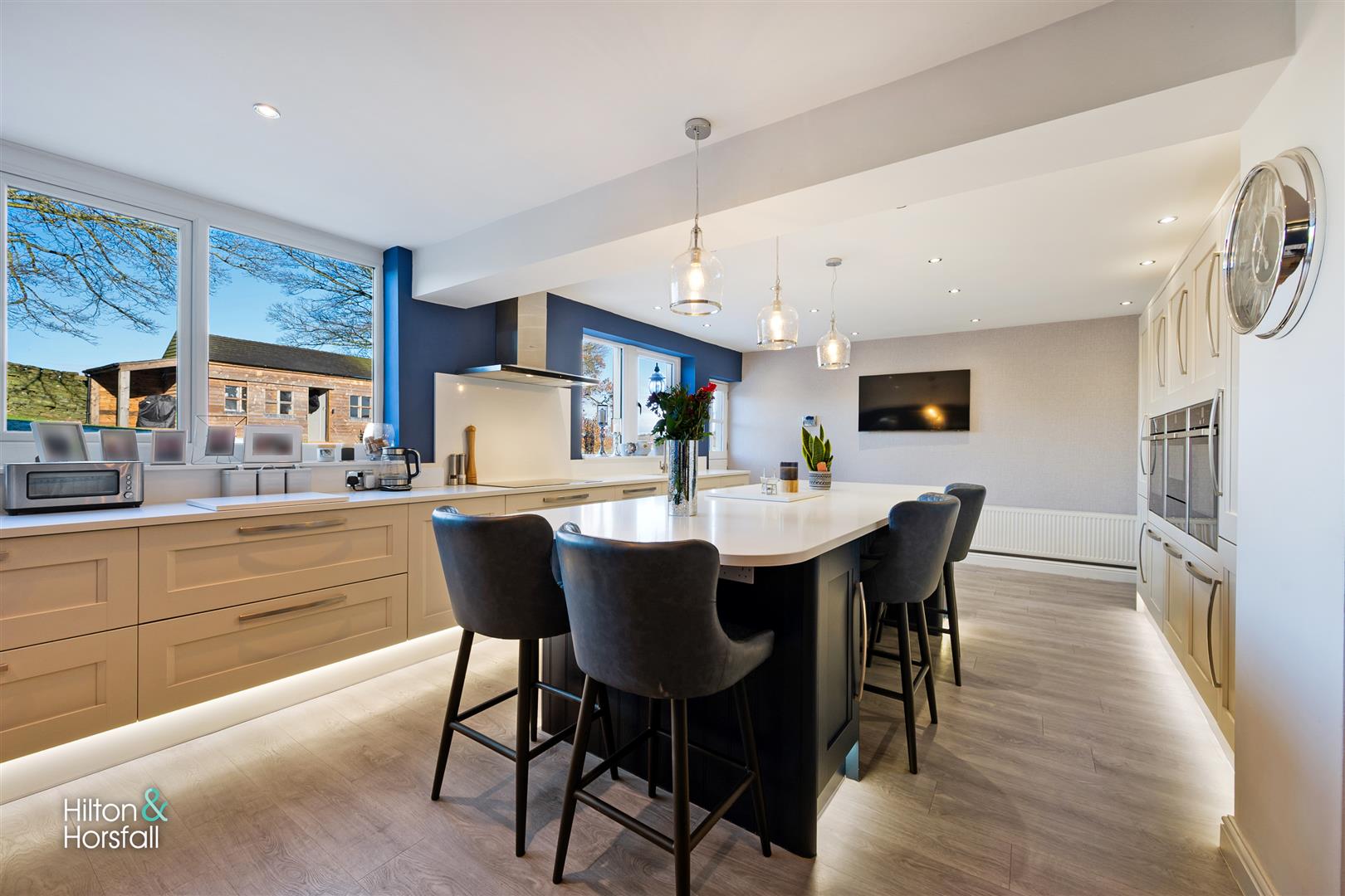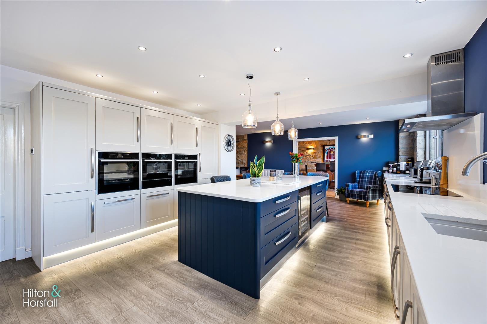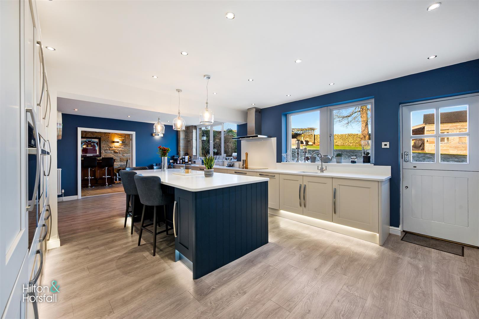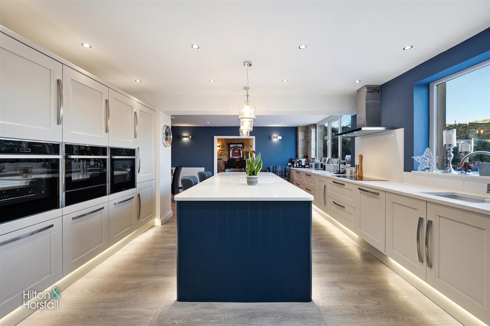 A simply stunning breakfast kitchen offering a range of soft close fitted wall and base units in grey, white granite work surfaces over, a large centre island / breakfast bar having fitted soft close base units in blue, white granite work surfaces over, 2x integrated Neff ovens, Neff integrated microwave, 60 / 40 integrated fridge / freezer, under counter base lights, integrated wine cooler, 2x large uPVC double glazed windows overlooking the rear garden, 1x stable style door to the rear elevation, integrated dishwasher, under mount sink with a mixer tap, Neff 5-ring induction hob, Neff air extraction hood, television point and 1x radiator.