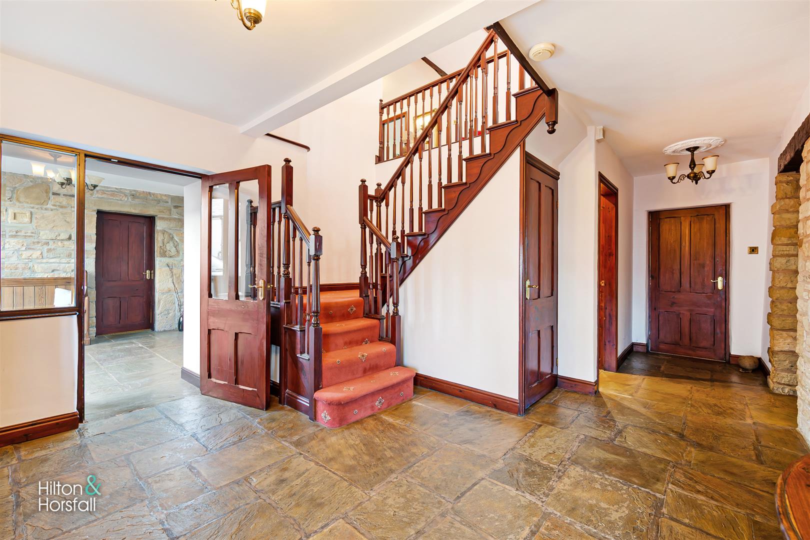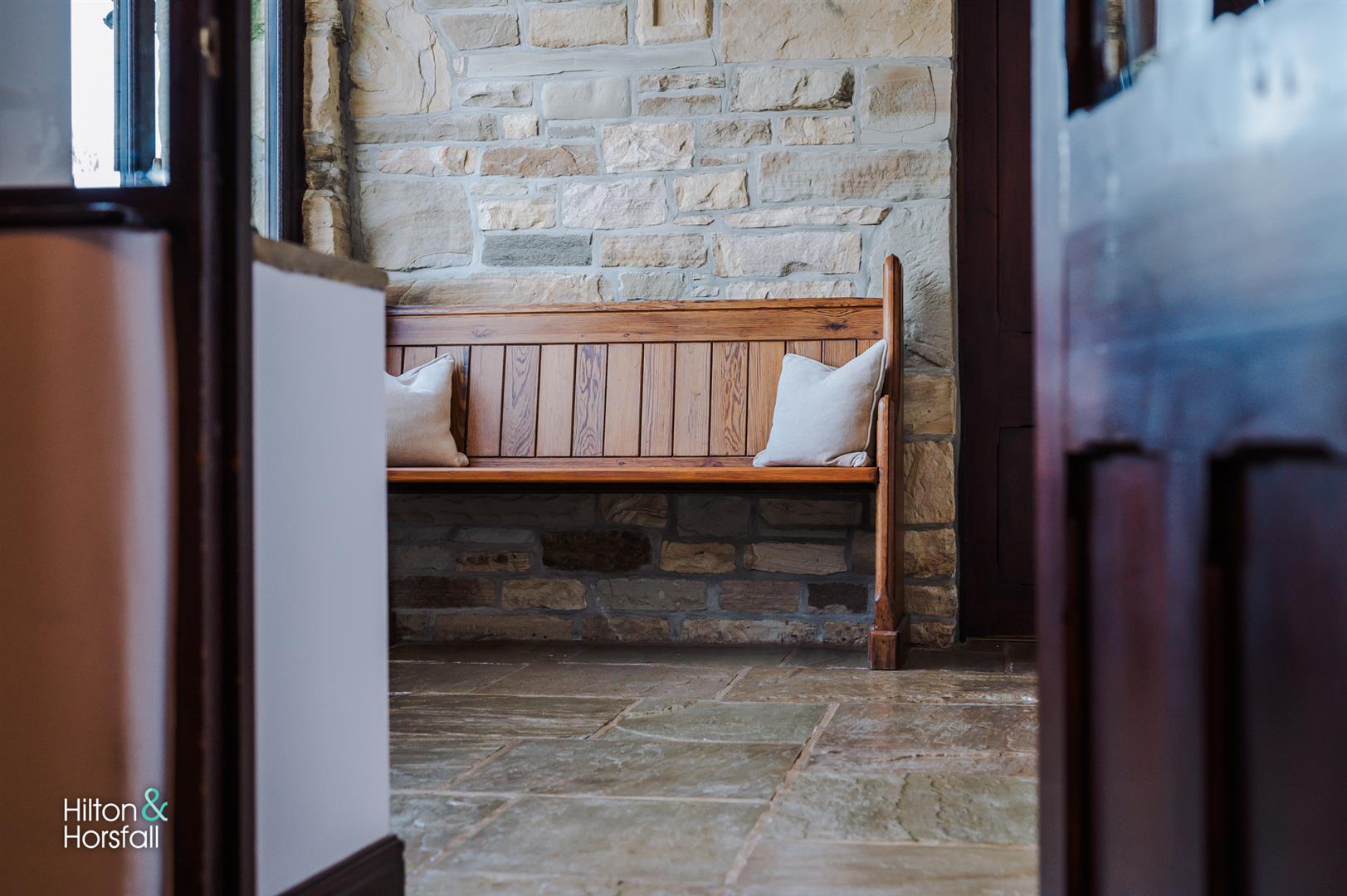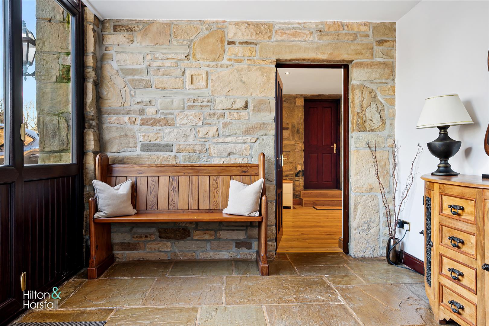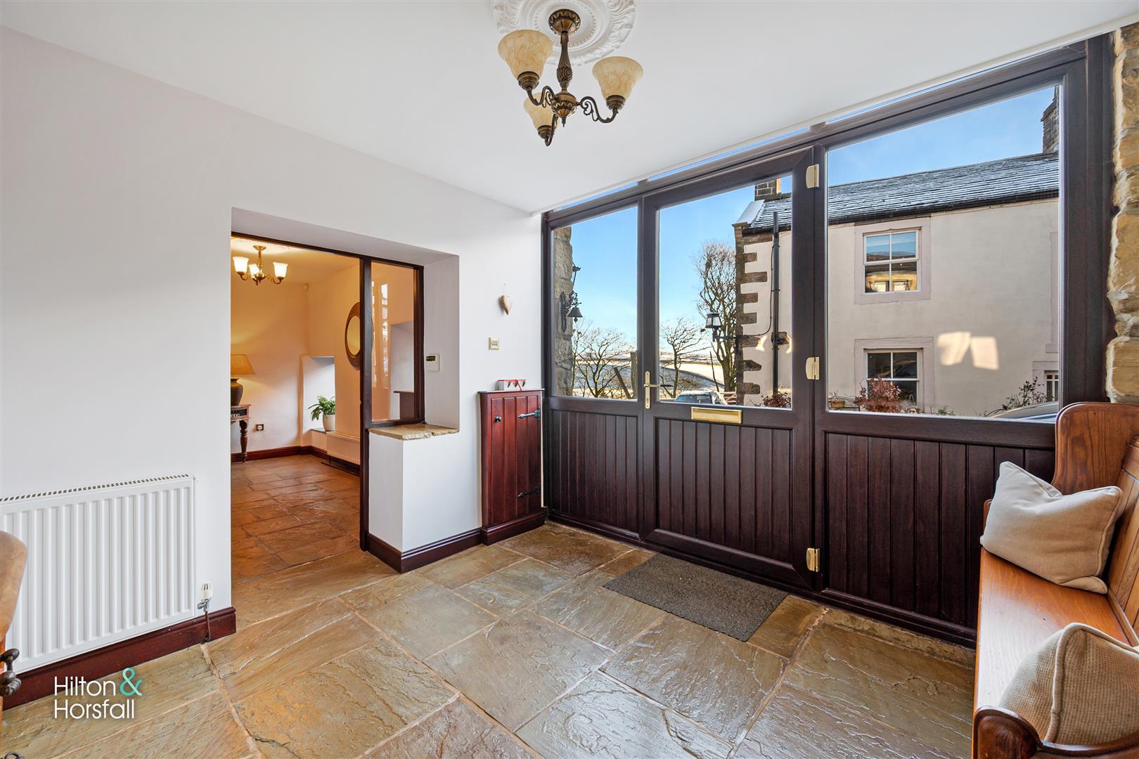 A welcoming entrance hallway having stone flag flooring, 1x radiator, feature stone flooring and 2x large uPVC double glazed windows to the front elevation offering far reaching views. With access through to: