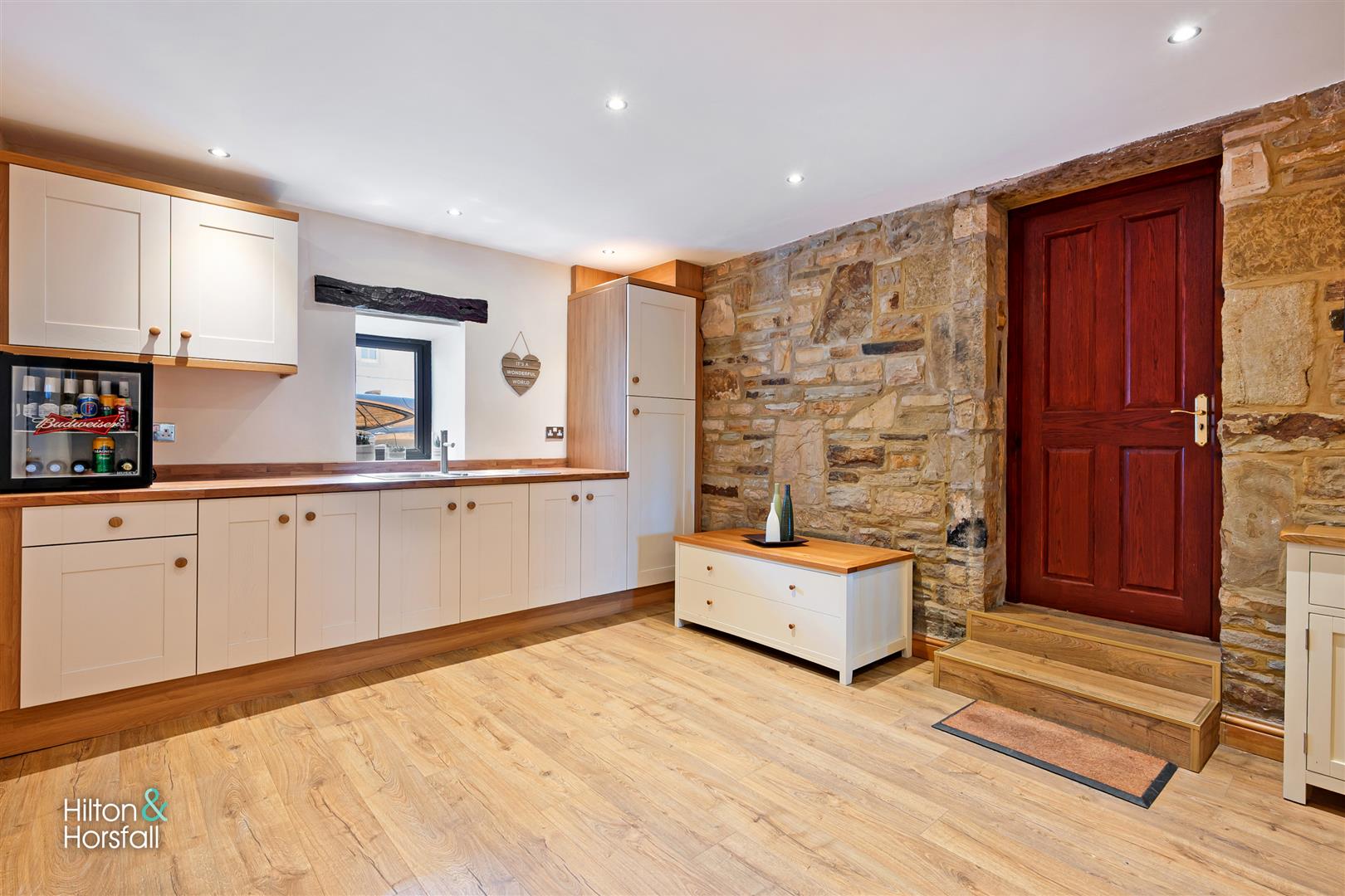 A spacious utility room offering fitted wall and base units in cream, wood work surfaces over, wood effect flooring, inset sink with a mixer tap, access to the boiler, a uPVC double glazed window to the front elevation, stone feature walls, space for an American style fridge / freezer, 1x radiator and access through to the integral garage and also access through to the home bar.