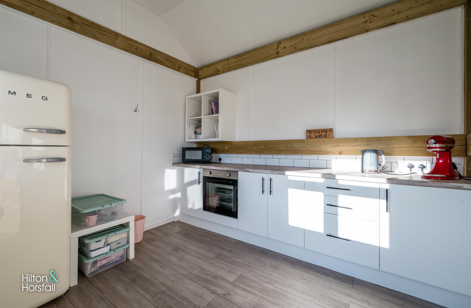 Set within a log effect cabin and being split into two rooms. Having a fitted kitchen area.