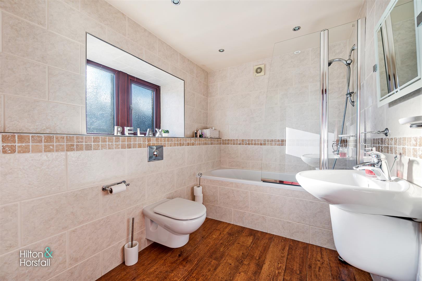 A 3-piece house bathroom comprising of: a wall mounted Roca sink with mixer tap, push button w.c, panelled bath with overhead shower, wood effect flooring, tiled walls, extractor fan, recessed spot lights, 1x radiator and a uPVC double glazed frosted window to the front elevation.