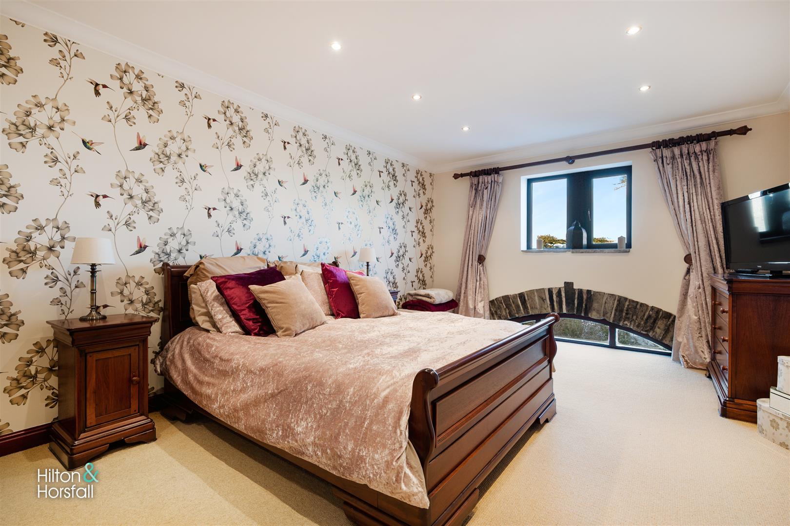 A fantastic opportunity to acquire this beautifully presented SIX bedroomed family dwelling which is situated on roughly four acres in a semi-rural part of town. Having breath taking open views surrounding. This stunning home affords many noteworthy features and is a great mix of traditional and modern. A true credit to the current owners. Briefly comprising of: an entrance hallway, reception hallway with timber staircase leading to the first floor / landing, ground floor w.c, fitted utility room, integral tandem garage with upstairs gym room, home bar, living room, sitting room, open plan dining area and a contemporary fitted breakfast kitchen with Neff appliances. To the first floor you will find a large landing, six double bedrooms (master with ensuite shower room & walk-in wardrobe) and a further two house bathrooms. The property is approached along a metalled driveway with access via a five bar gate to a large gravelled driveway at the side which provides ample turning / parking space. Externally you will find ample parking spaces, patio seating area, a large mature lawn, access to the cabin, breath taking views over the surrounding countryside and access to the paddock and woodland area. Council Tax Band 'F'. Freehold. One not to be missed.