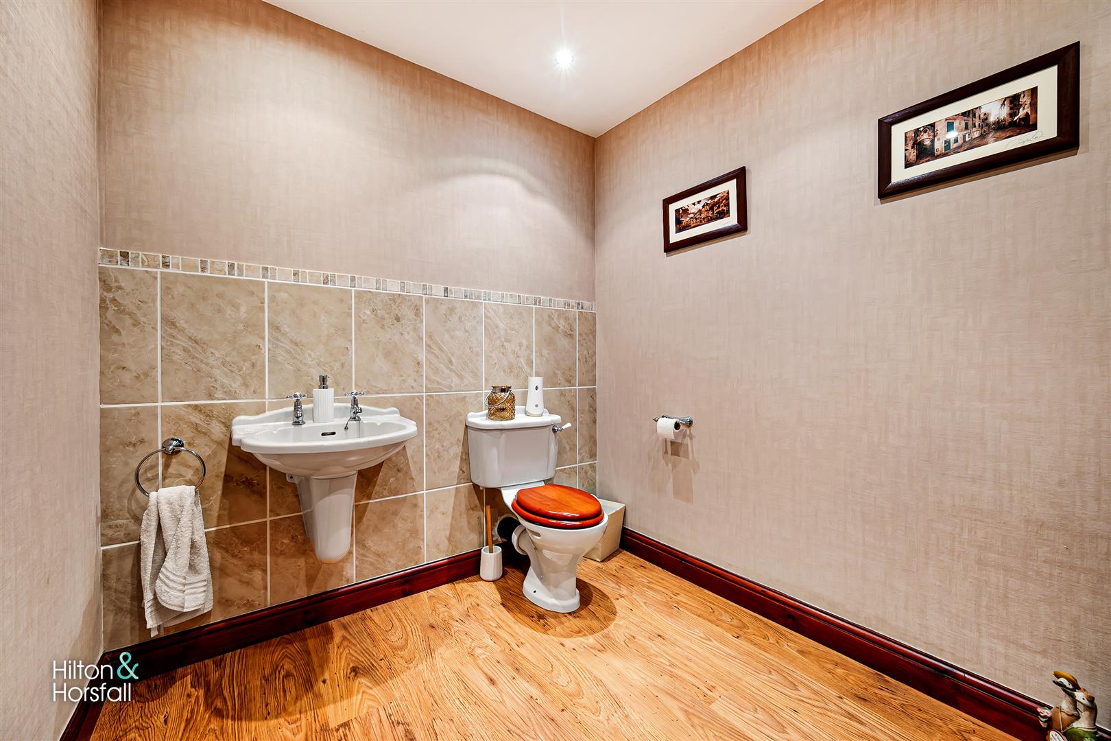 A generous sized ground floor w.c having a low level w.c, wall mounted sink, wood effect flooring, partially tiled walls and spot lights.
