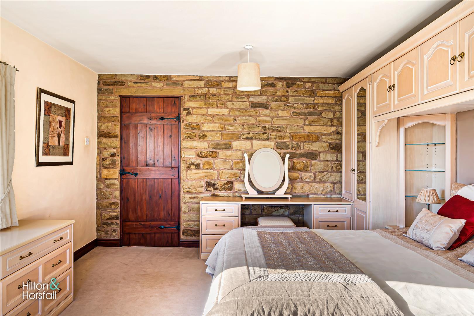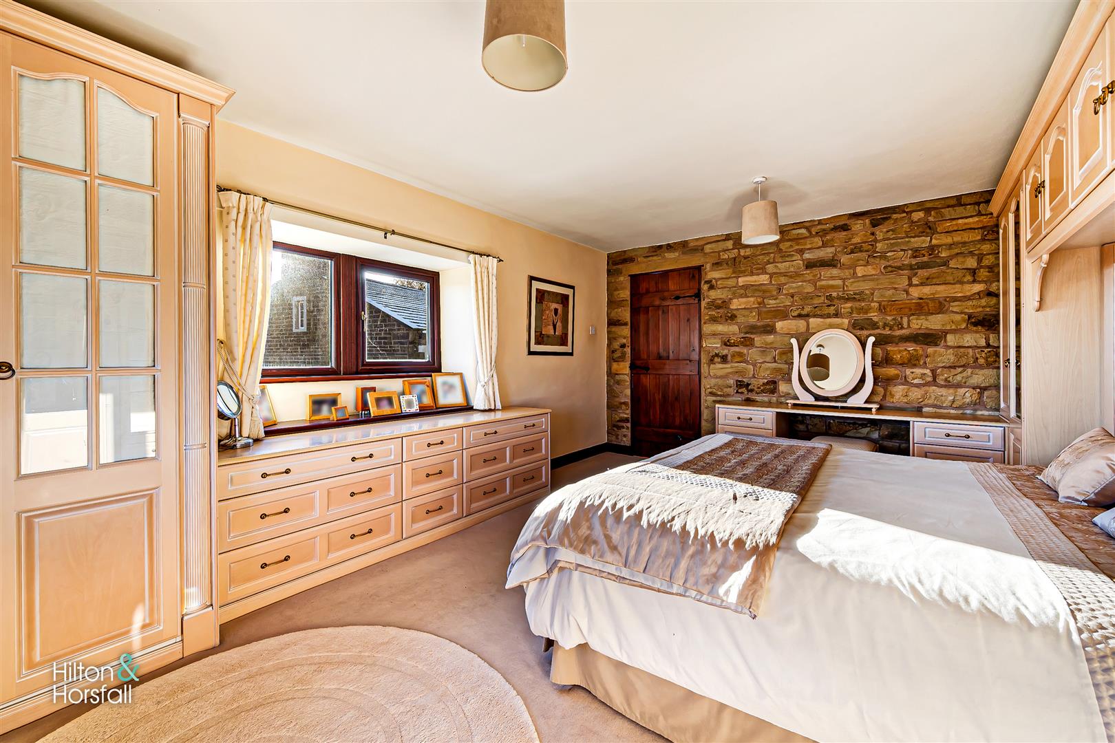 Another room of double proportions having fitted wardrobes, fitted dresser, fitted drawers, 1x radiator, feature stone wall, a uPVC double glazed window to the side & front elevation both offering open aspect views.
