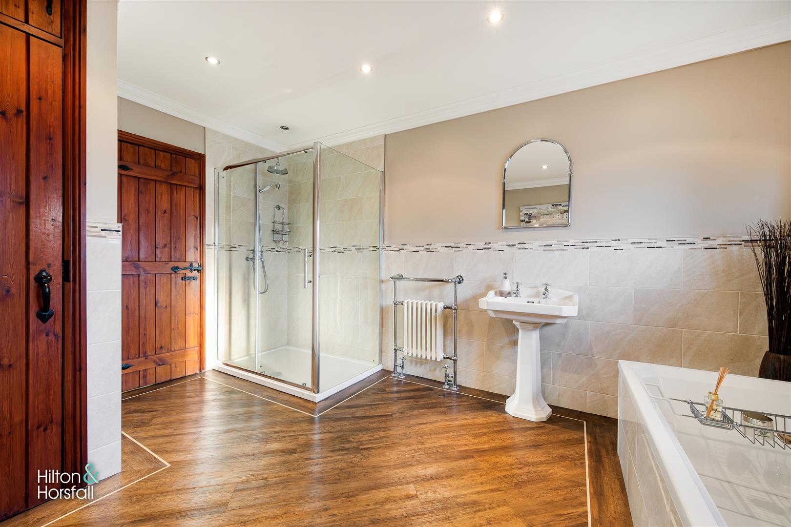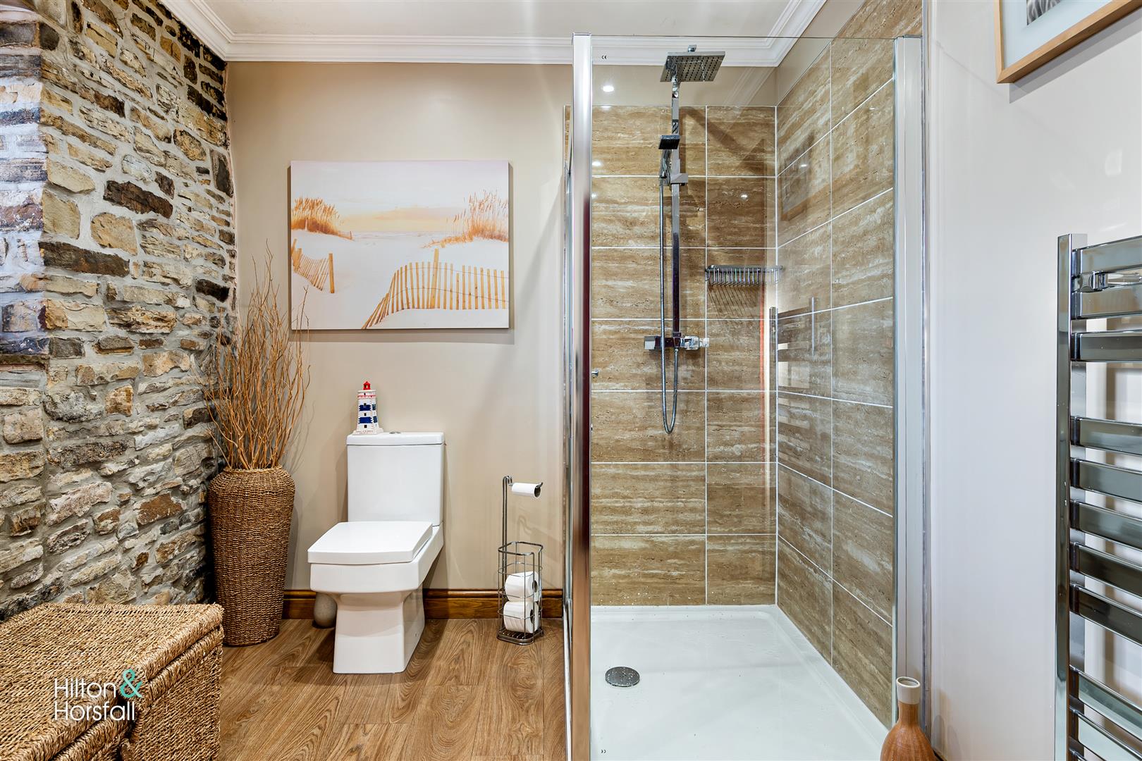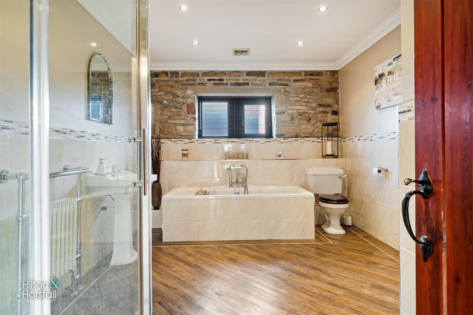 A modern 4-piece house bathroom comprising of: a walk-in shower with rainfall shower head, low level w.c, panelled bath with a mixer tap, Heritage pedestal sink, 1x radiator, 1x towel radiator, coving, extractor fan, spot lights, feature stone wall, wood effect flooring, partially panelled walls, a frosted uPVC double glazed window to the front elevation and inbuilt airing cupboard.