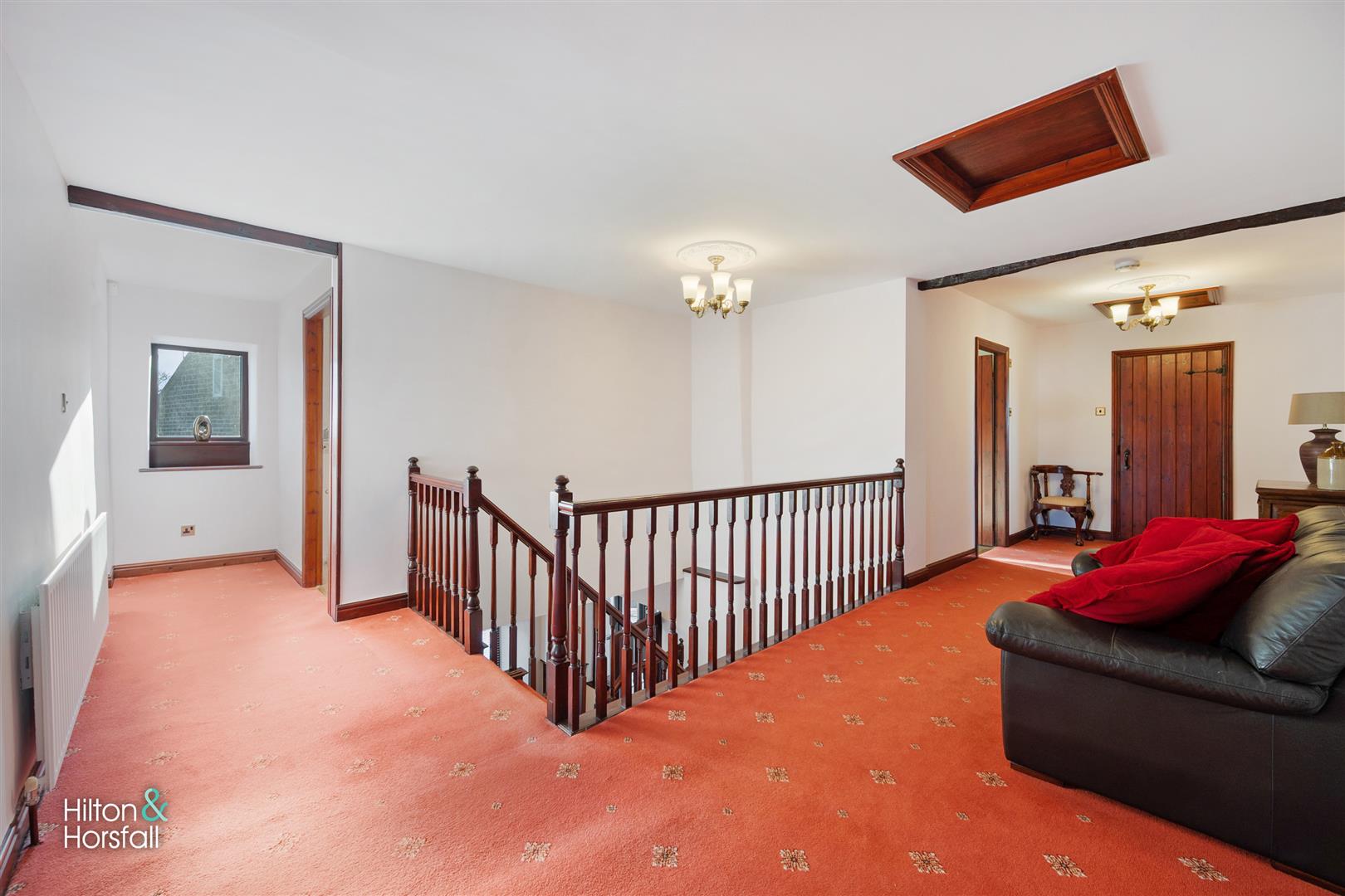 Large open landing area with seating area, 1x radiator, access to loft hatch and a uPVC double glazed window to the front elevation.
