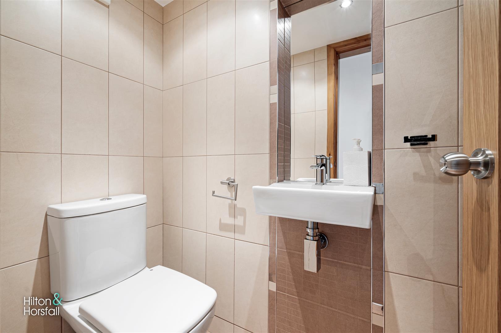 A useful downstairs w.c comprising of: tiled flooring and walls, push button w.c, wall hung sink with chrome mixer tap, recessed LED spotlights, air extraction fan and 1x central heating radiator.