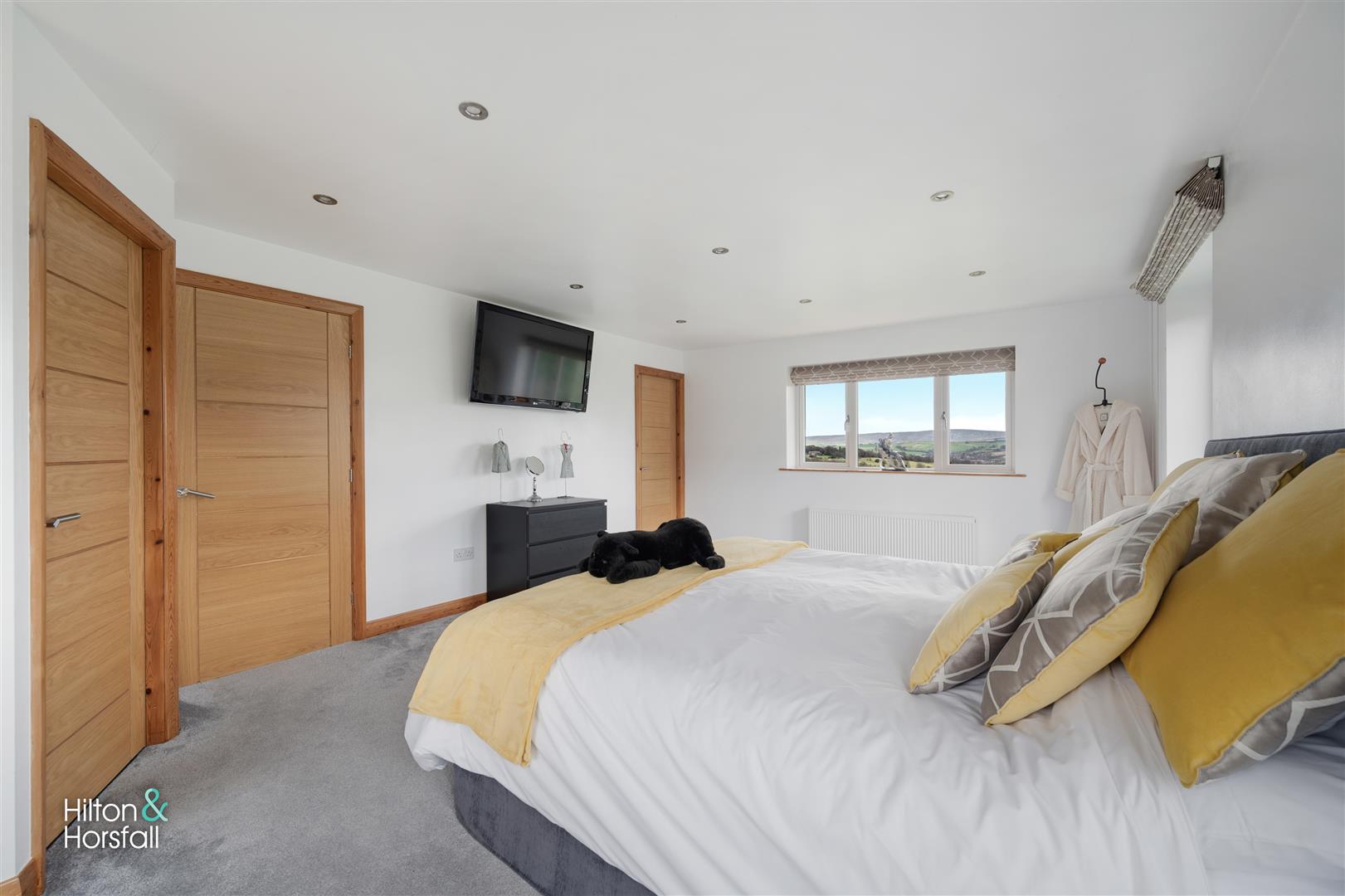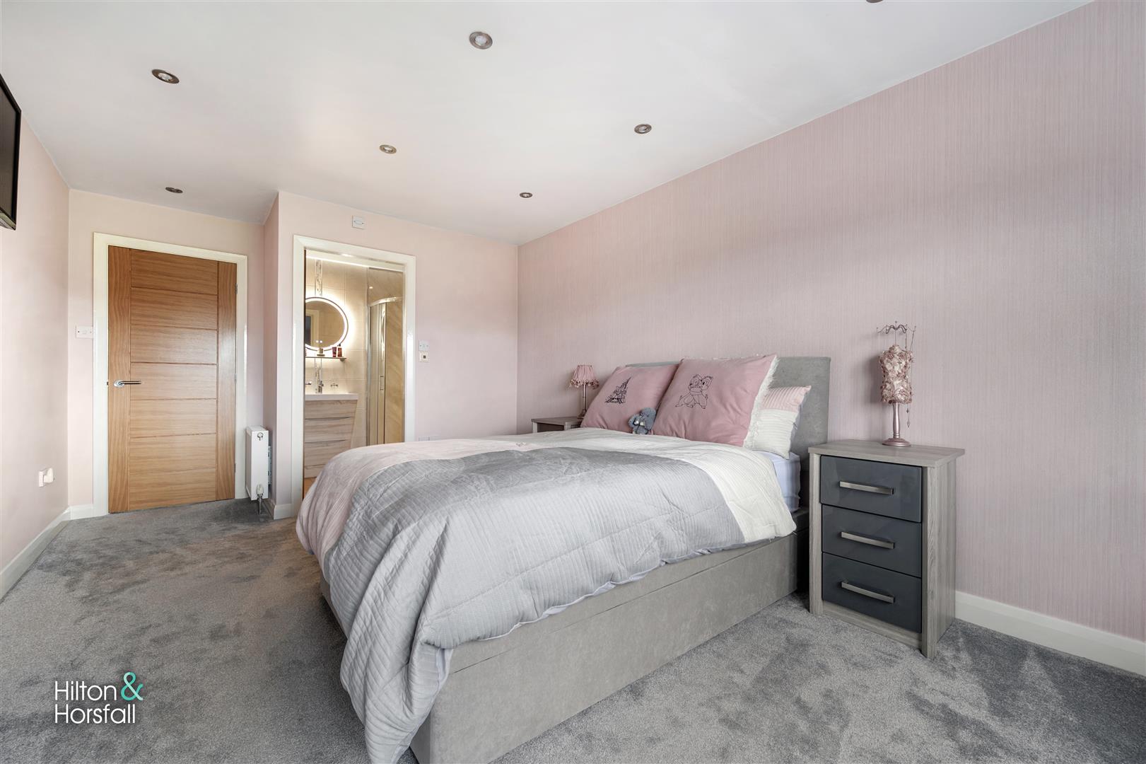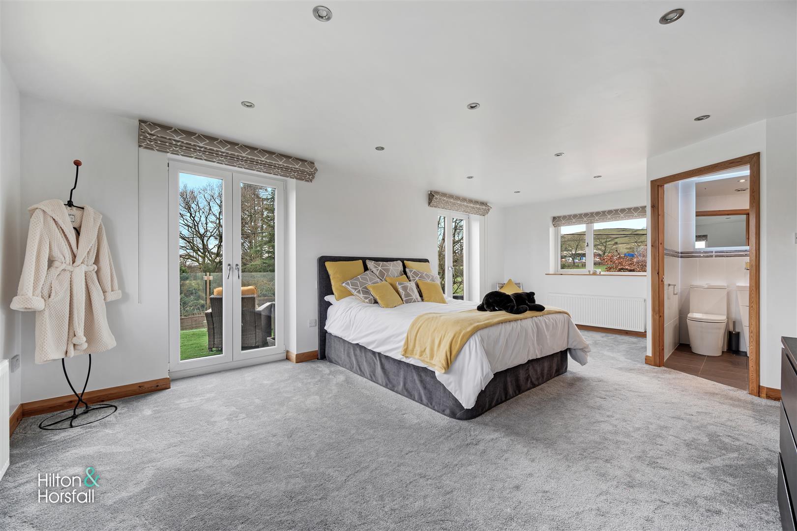Another bedroom of double proportions with space for wardrobes and drawers, recessed LED spotlights, 2x central heating radiators, television point, door leading through to en-suite and uPVC double glazed window to the side elevation with countryside views