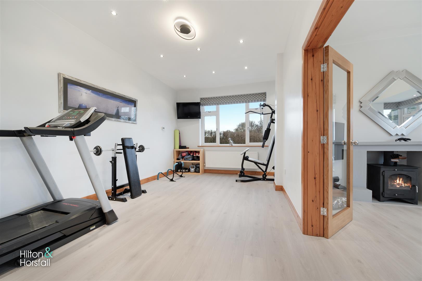 A large dining room currently utilised as a home gym which is ideal for hosting, having wood effect flooring, 2x central heating radiators, space for table and chairs, recessed LED spotlights, solid oak wood french doors with glass panel leading through to the sitting room and uPVC double glazed window to the side elevation.