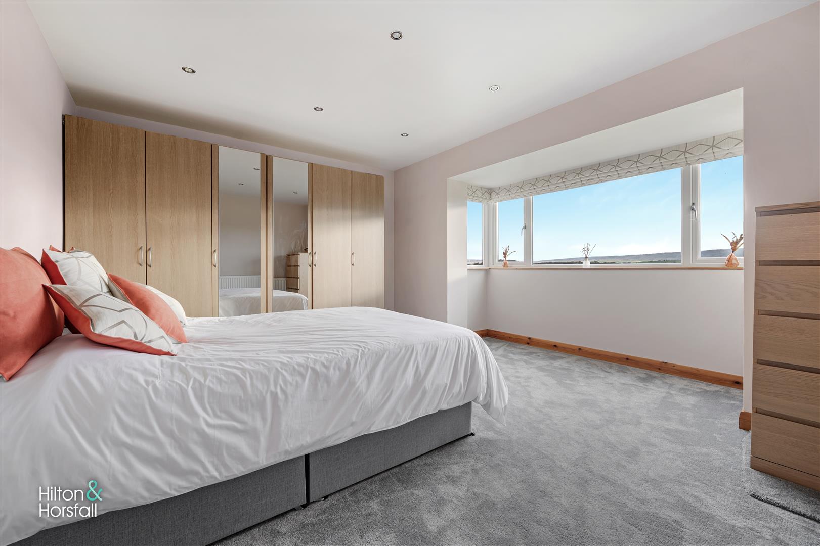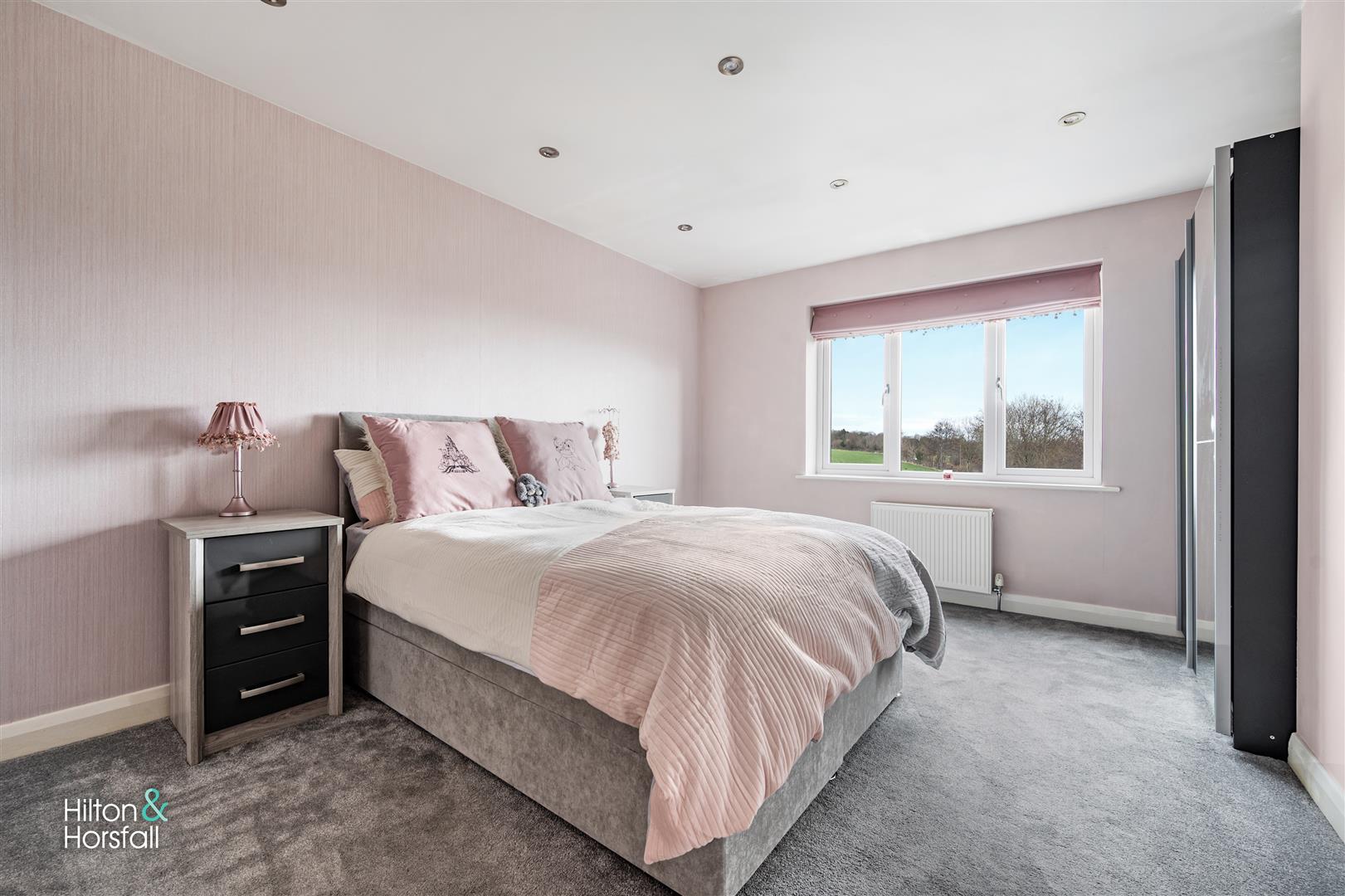 A bedroom of double proportions having space for wardrobes and drawers, recessed LED spotlights, 1x central heating radiator and uPVC bay fronted window offering stunning views towards the countryside.