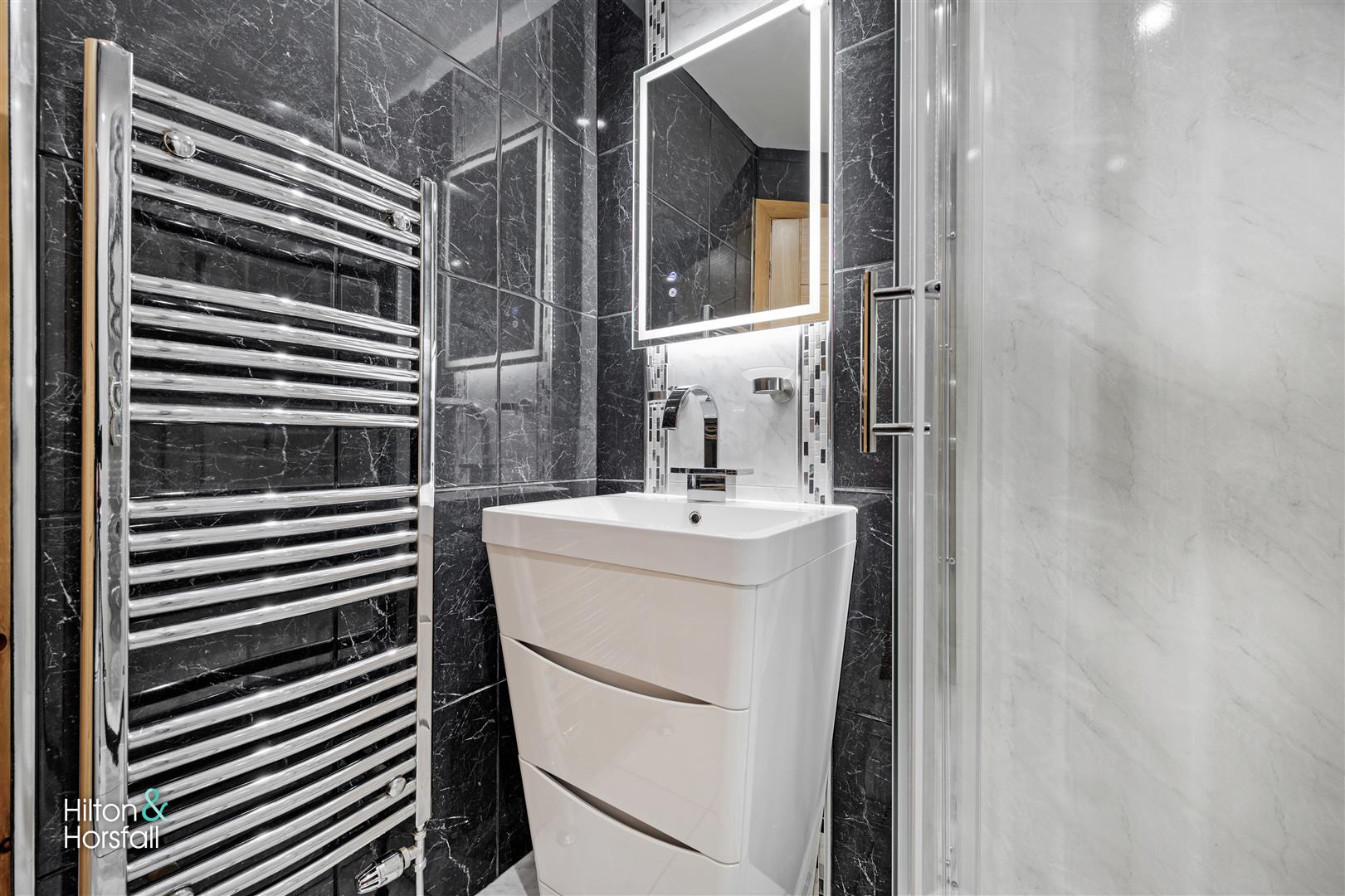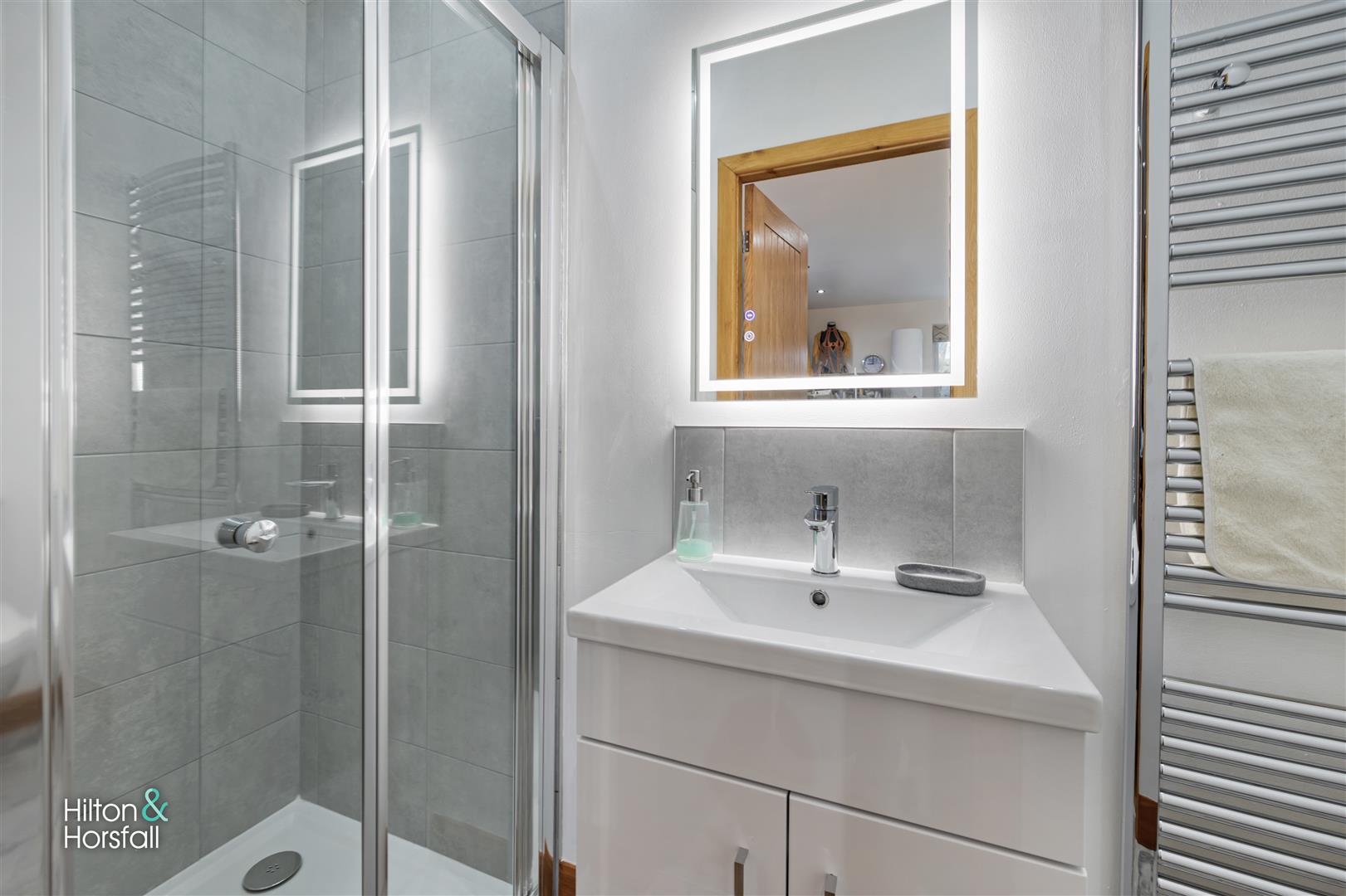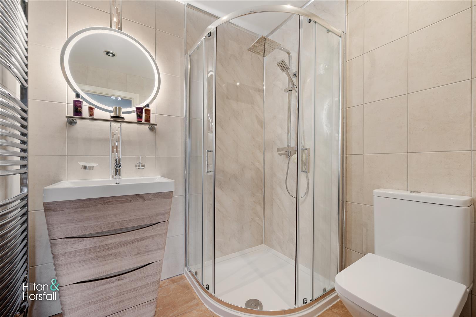 A three piece shower room suite comprising of: tiled flooring and walls, underfloor heating, push button w.c, vanity sink with chrome mixer tap, shower cubicle with rainfall shower head, heated chrome towel rack, touch sensor LED mirror and recessed LED spotlights.