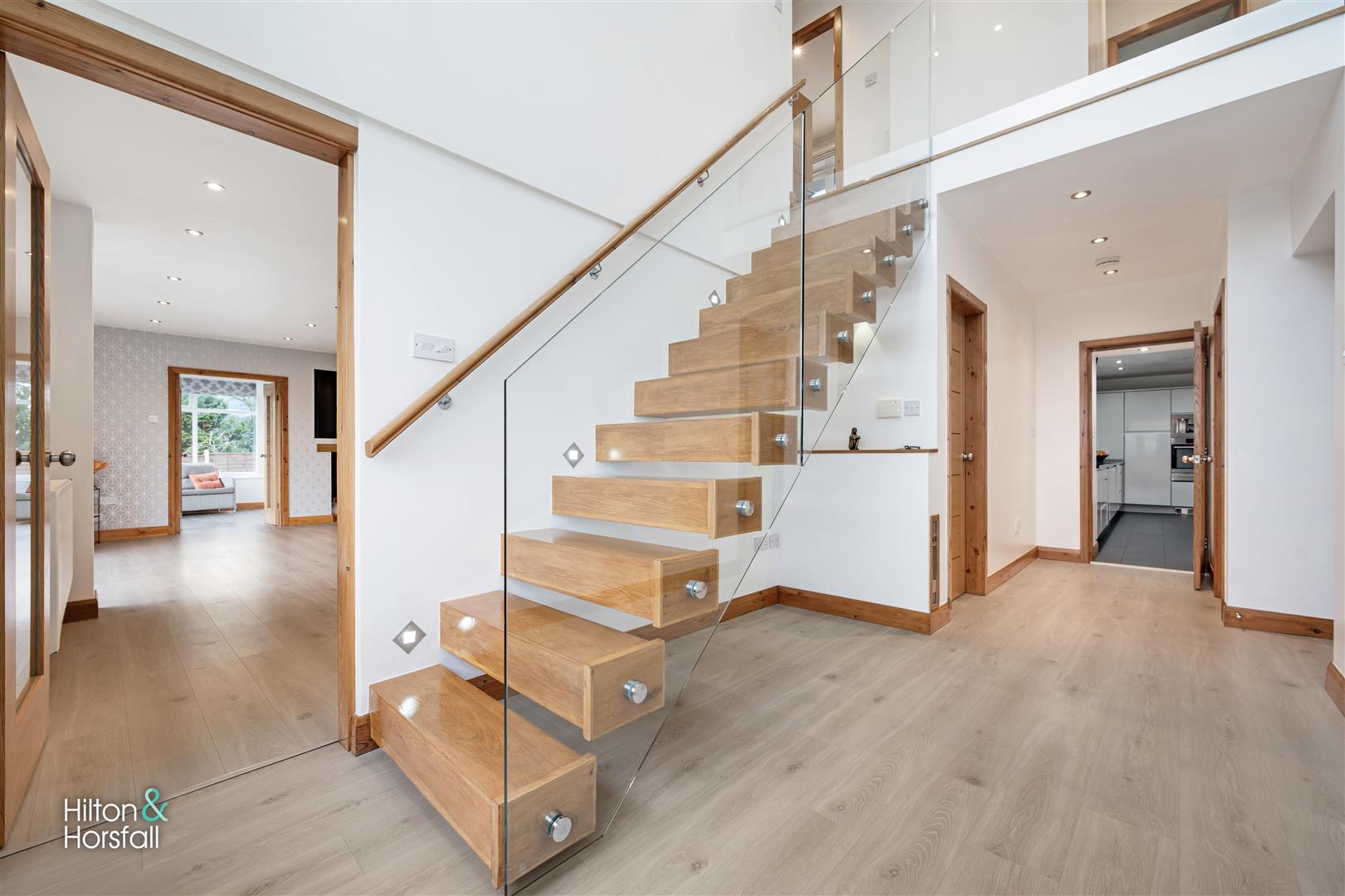 A welcoming entrance hallway having wood effect flooring, recessed LED spotlights, open balustrade staircase to the first floor / landing with a glass panel, uPVC door to the front elevation and uPVC double glazed windows to the front elevation offering stunning countryside views.