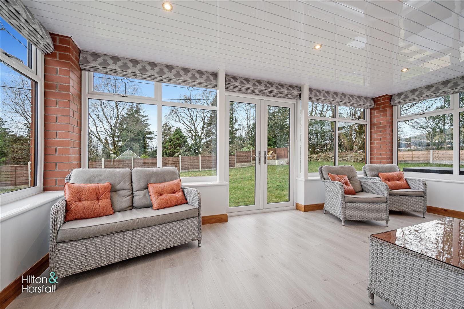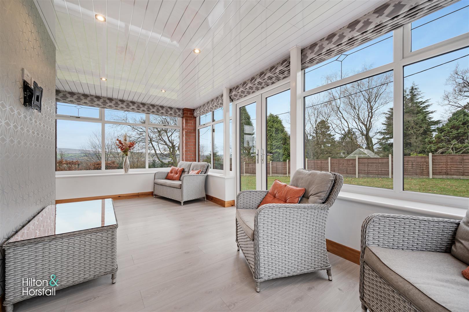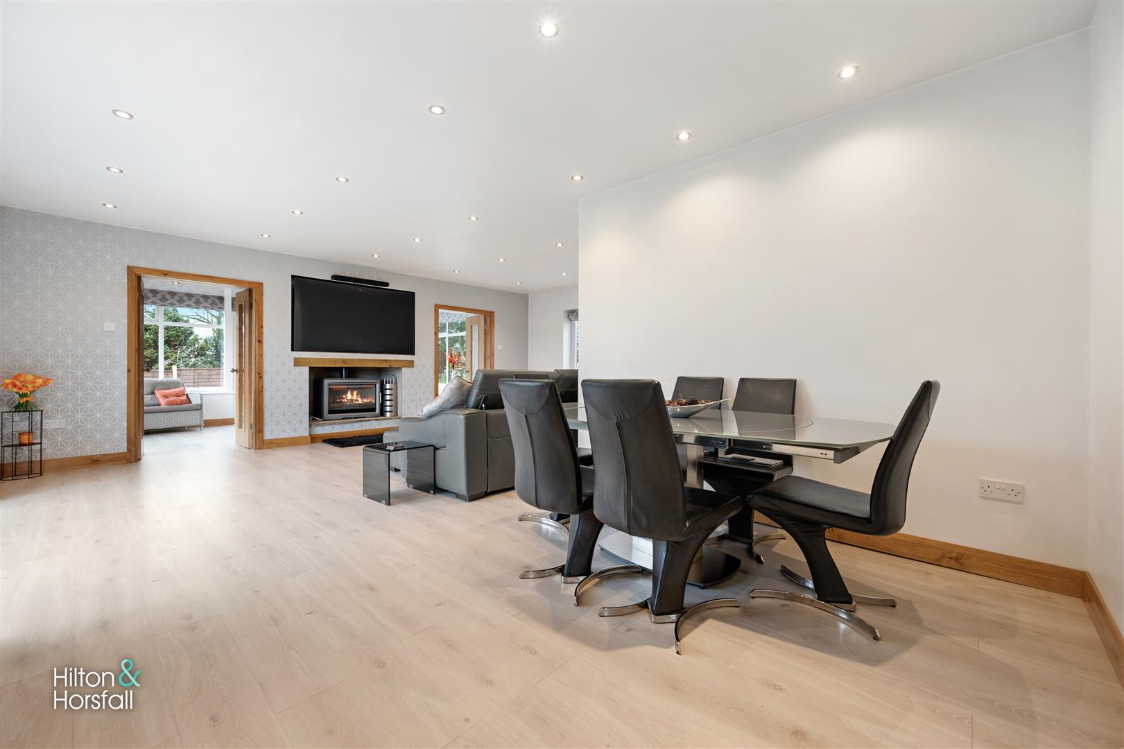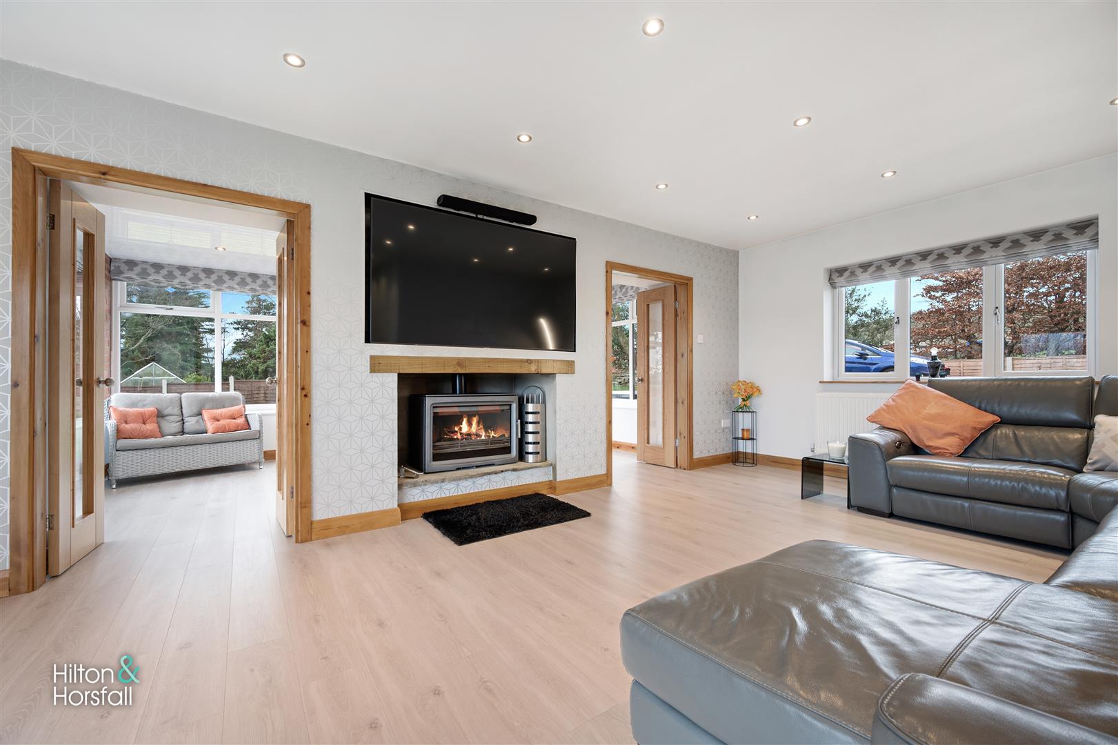 A bright and airy sunroom with wood effect flooring, space for settees, recessed LED spotlights, 2x wall mounted modern anthracite radiators, double solid oak doors with glass panels leading through to the living room, uPVC patio doors leading out to the garden and uPVC double glazed window to the rear elevation.