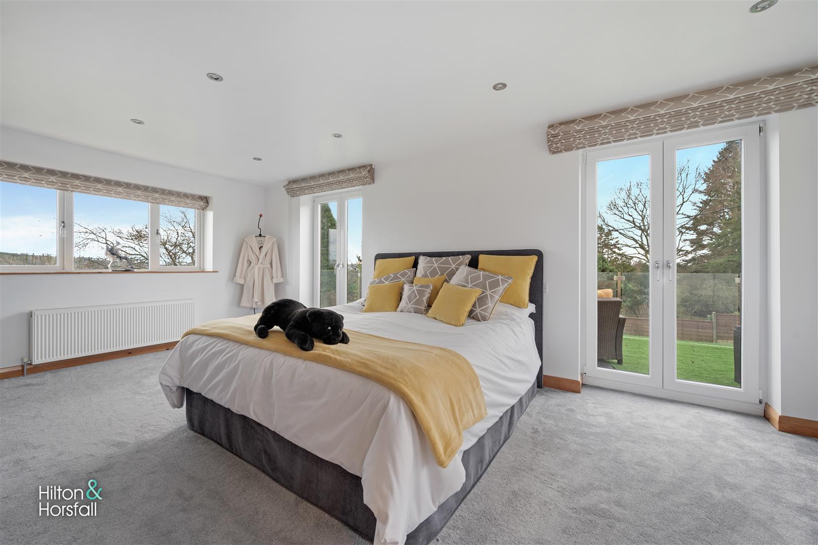 A bedroom of double proportions having space for wardrobes and drawers, 2x central heating radiators, recessed LED spotlights, television point, uPVC double glazed window to the front and rear elevation, 2x patio doors leading out onto the balcony which has an artificial lawn, glass balcony, space for outdoor furniture, providing stunning views to the countryside.