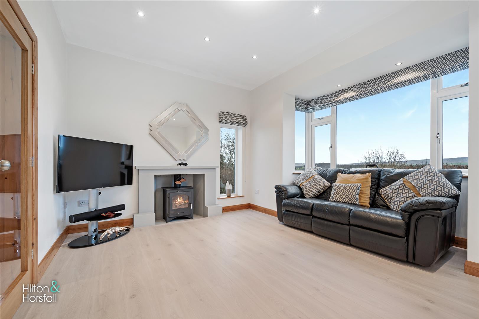 A family sized living room having wood effect flooring, space for settees, 2x central heating radiators, media wall with television point, wall feature fireplace with log burning stove set within, space for table and chairs, recessed LED spotlights, uPVC double glazed windows to the rear elevation, 2x solid oak wood french doors leading through to the sunroom and uPVC patio doors to the front elevation with stunning open aspect views towards the countryside.
