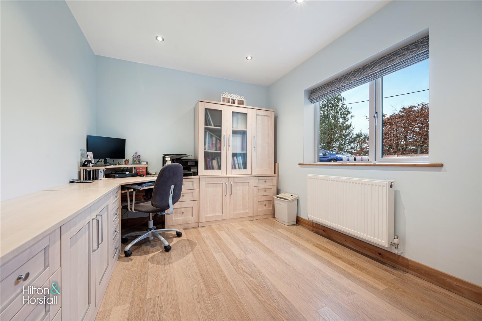Having a multitude of uses this room benefits from wood flooring, space for desks and drawers, recessed LED spotlights, 1x central heating radiator and a uPVC double glazed window to the rear elevation.