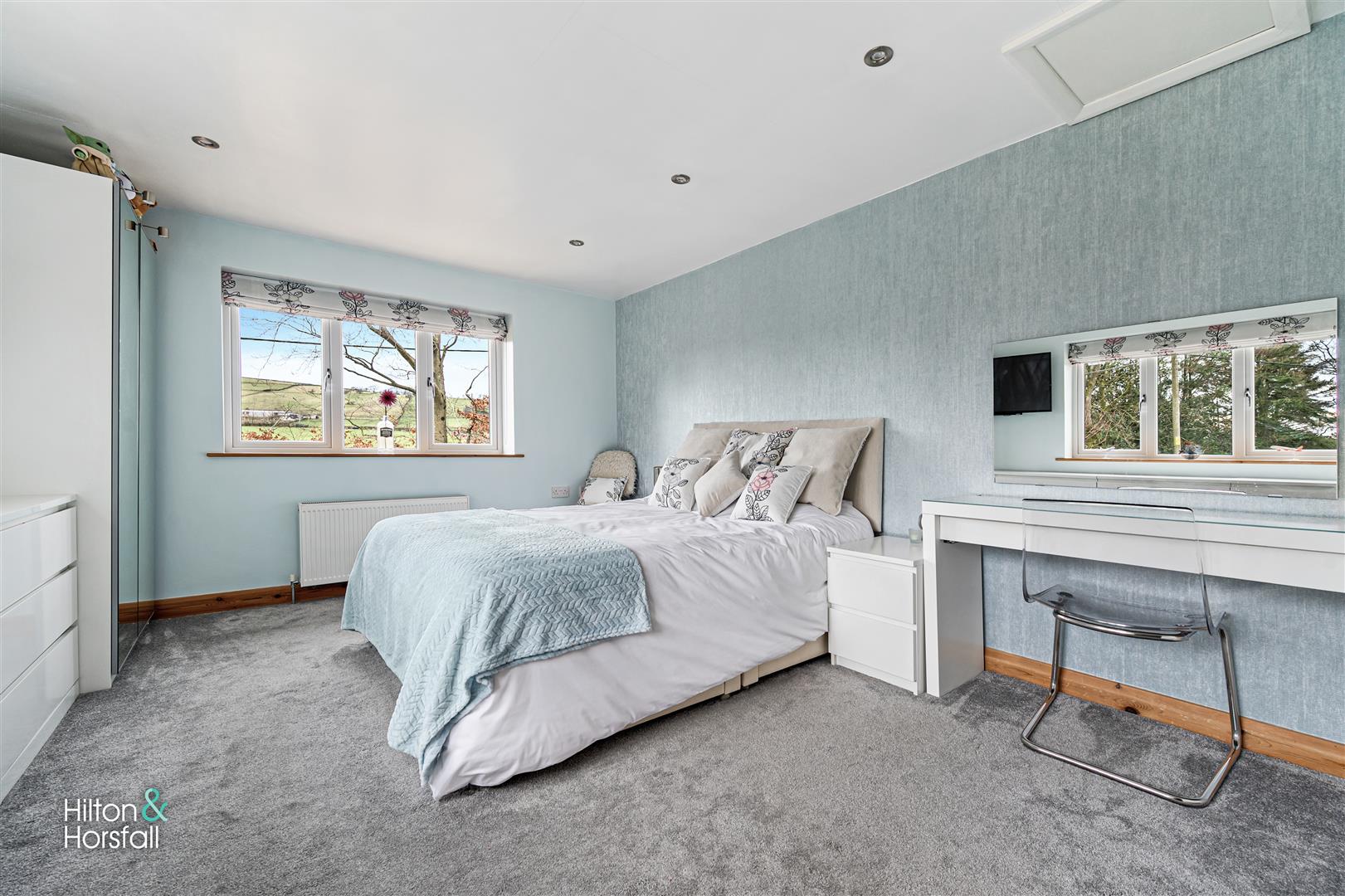 A bedroom of double proportions having space for wardrobes and drawers, 2x central heating radiators, recessed LED spotlights, loft hatch, door to en-suite and uPVC double glazed window to the side and rear elevation offering stunning views.