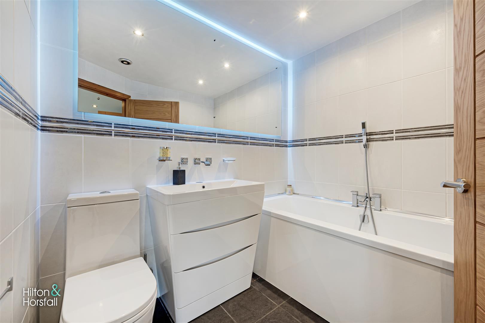 A three piece suite having underfloor heating, push button w.c, panelled bathtub with chrome mixer tap, tiled flooring and walls, vanity sink with chrome mixer tap, illuminated mirror, heated chrome towel rack and recessed LED spotlights.